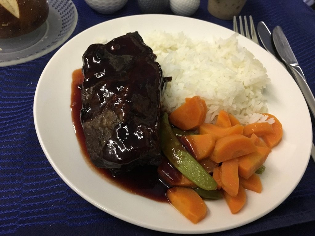 Als Hauptspeise habe ich mich für die geschmorte Rinderrippe entschieden. Diese war butterweich und mit der Rotweinsoße sehr lecker. Auch dieses Gericht findet Ihr so in der Polaris Business Class.