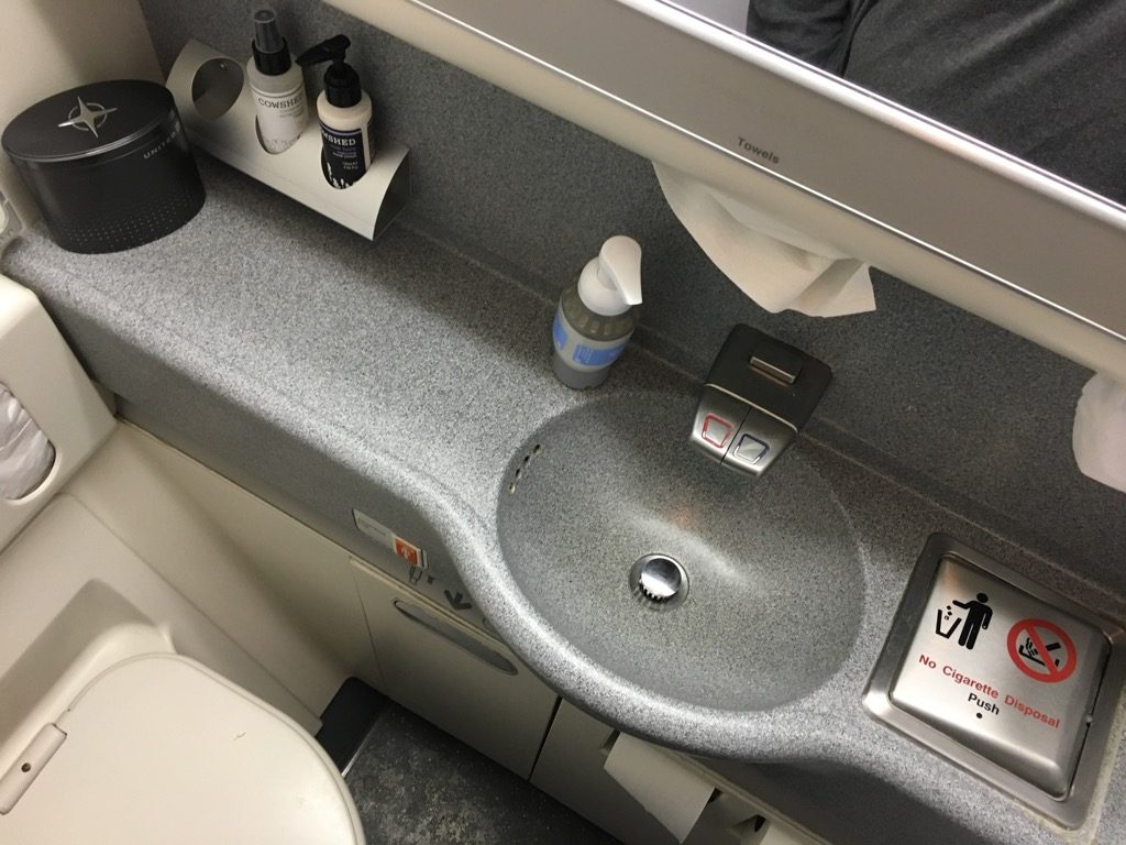 Die United Polaris First Class verfügt nur über eine Toilette direkt hinter dem Cockpit. Diese Toilette unterscheidet sich auch nicht von anderen Flugzeugtoiletten und auch ihr hat man ihr Alter bereits angesehen. Allerdings war die Toilette den gesamten Flug über sehr sauber.