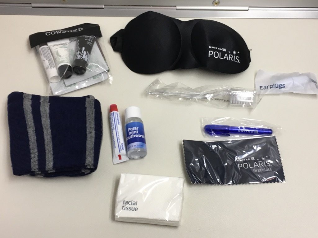 Bereits beim Boarding lag das Amenity Kit auf dem Sitz. Dieses unterscheidet sich quasi nicht von  denen in der Business Class. Nur die Farbe der First Class Amenity Kits ist eine andere und es liegt ein Brillenputztuch mit dem Aufdruck United Polaris First Class bei. Der Inhalt selbst ist mit der Business Class identisch, bietet allerdings alles was man für einen Flug braucht. Besonders Hhchwertig, wie bei anderen Airlines in der First Class, ist der Inhalt allerdings nicht.