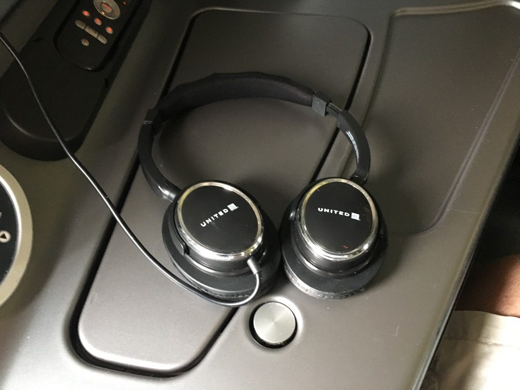 Über dem Ottomanen befindet sich der Fernseher mit dem Entertainment System. Dieser ist erstaunlich klein, erfüllt allerdings seinen Zweck. United verwendet in der First und Business Class die gleichen Kopfhörer. Diese sind grundsätzlich völlig in Ordnung, allerdings bevorzuge ich meine Bose IQ25 Kopfhörer, welche deutlich besser sind, als die von United.