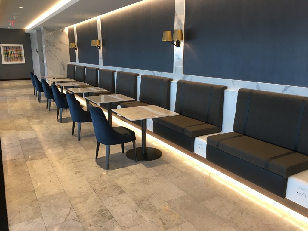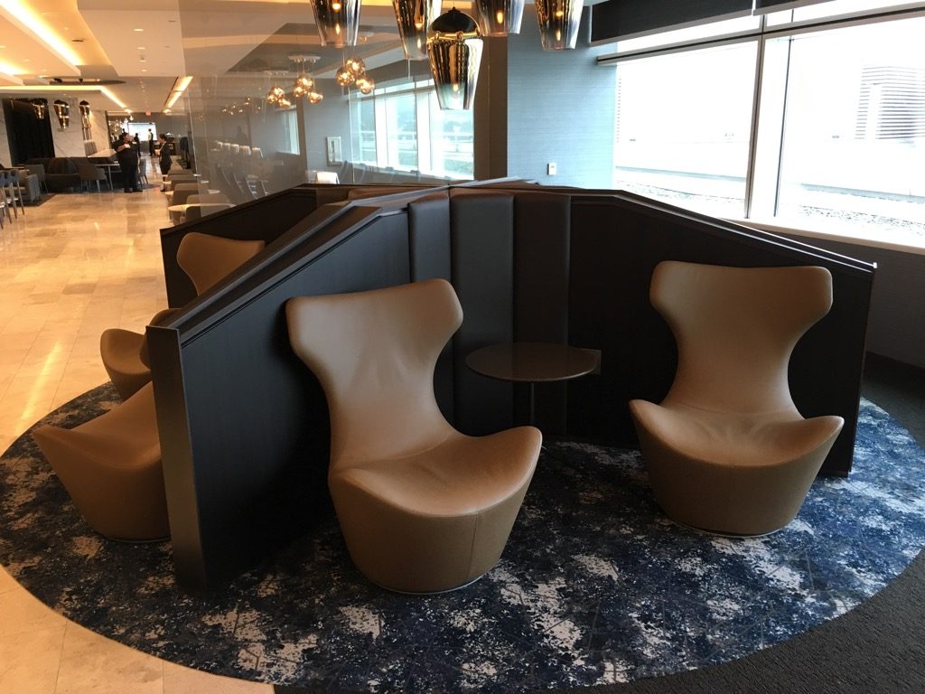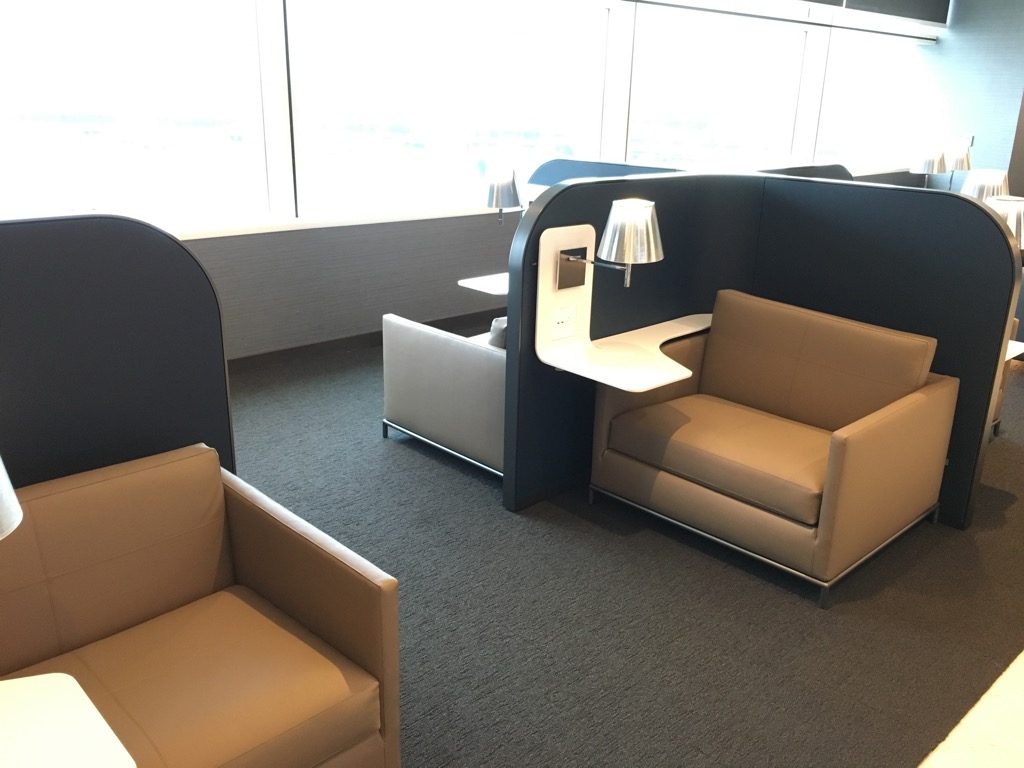 Neben Sitzgruppen mit Sesseln findet man in der United Polaris Lounge in Newark auch Couches und abgeschirmte Sitze, welche sich zum Arbeiten eignen, sowie Tische und Stühle zum Arbieten oder Essen. Ich persönlich mag diese sehr gerne.