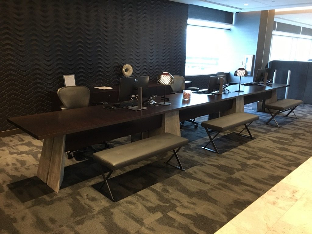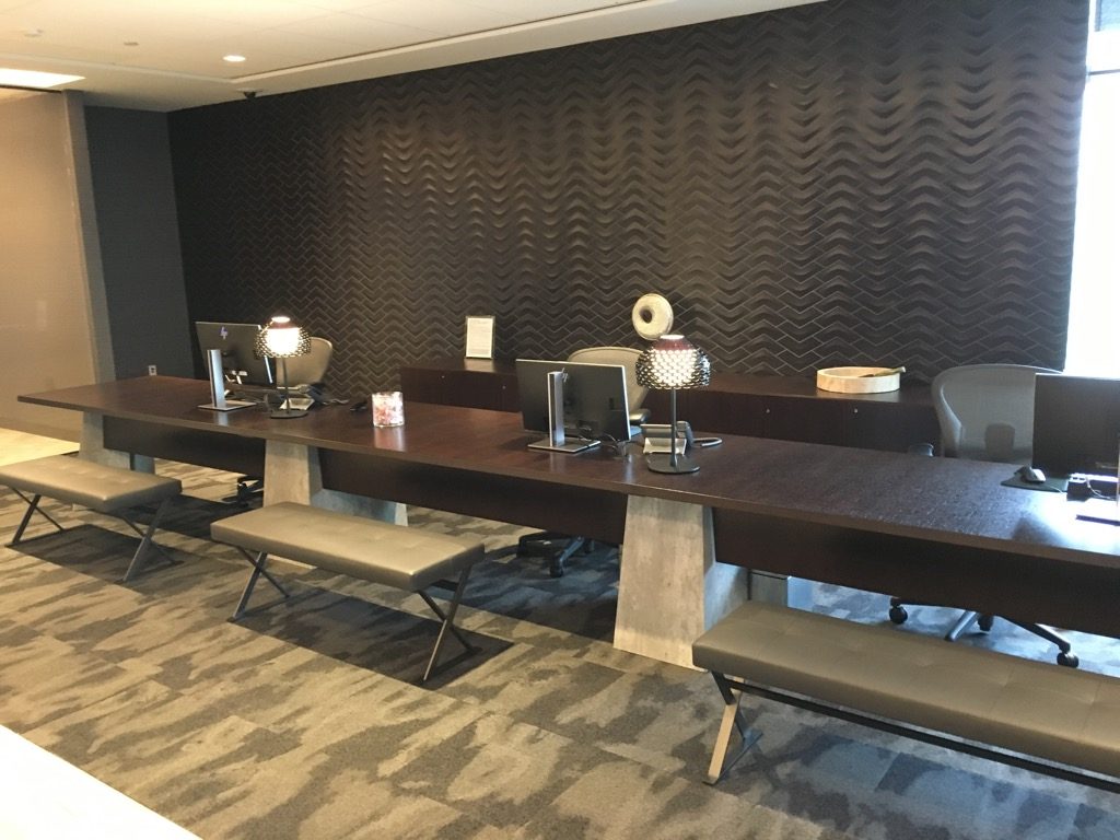 Die obere Etage der United Polaris Lounge San Francisco ist in mehrere Bereiche unterteilt. Geht man nach der Rolltreppe nach links, findet man hier zuerst einen Service Desk mit Global Services Agents. Diese können Euch bei kleineren und größeren Anliegen zu Eurem Flug oder Eurer Buchung helfen und sind im Allgemeinen sehr fähig.