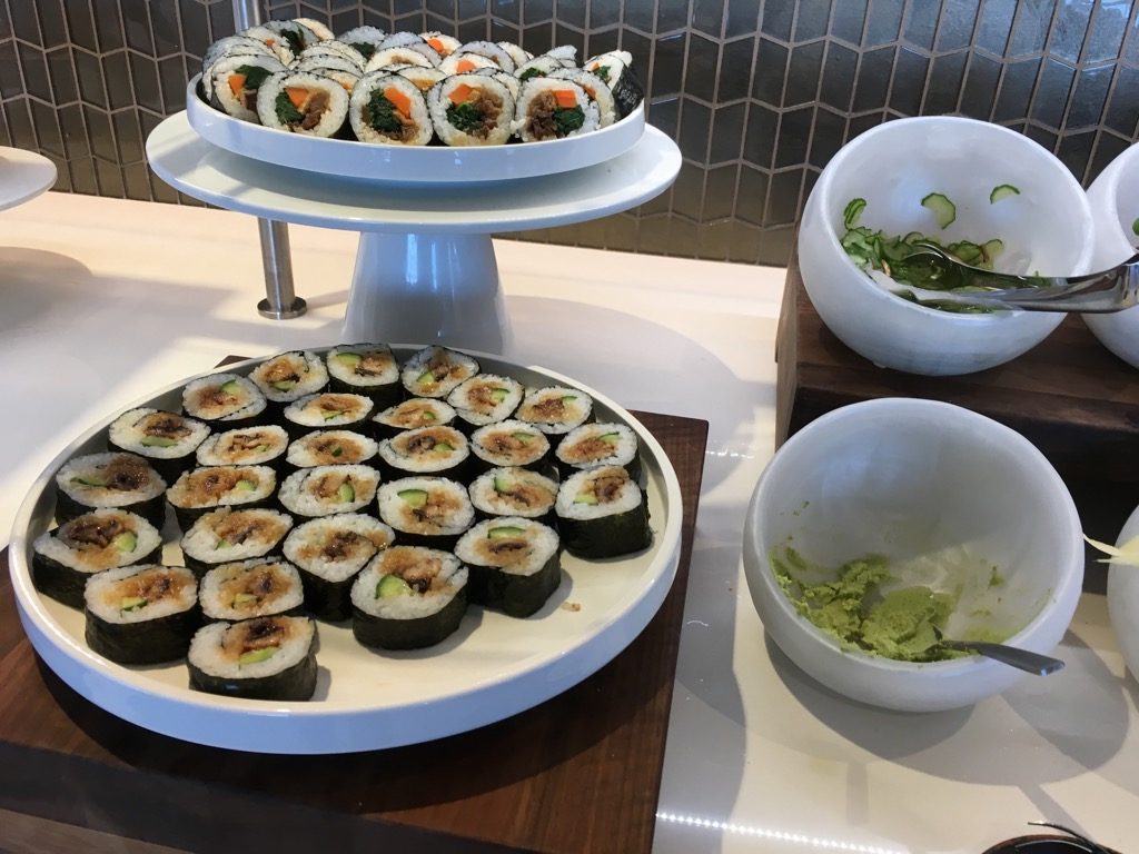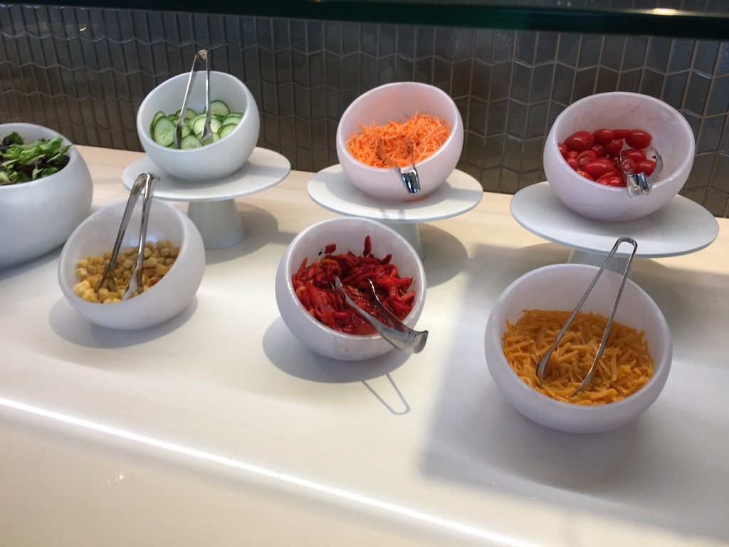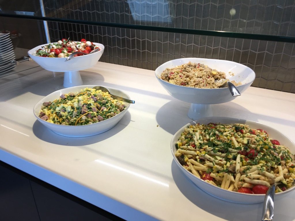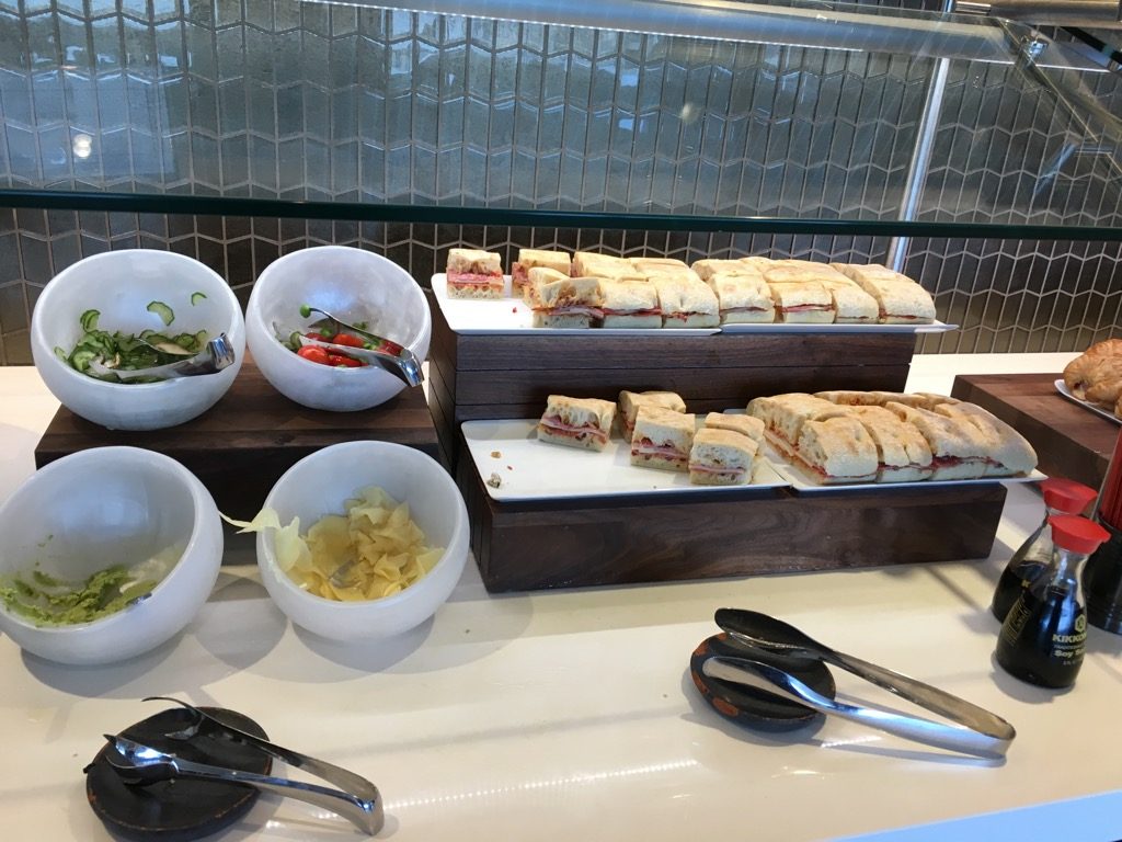 Am Ende der Lounge befindet sich das Buffet zur Selbstbedienung. Hier findet man neben Salaten, Vorspeisen, Sandwiches und Desserts auch einige warme Hauptgerichte und eine asiatische Nudelsuppenbar. Allerdings war die Auswahl an warmen Speisen deutlich geringer, als z.B. in der United Polaris Lounge Newark. Die Qualität der Speisen auf dem Buffet war sehr gut.