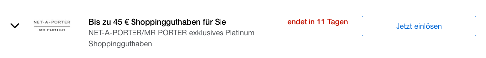 Neben 200 Euro Reiseguthaben und 200 Euro SixtRide Guthaben, bietet die Amex Platinum auch noch ein etwas weniger bekanntes 90 Euro Shopping Guthaben. Dieses Shopping Guthaben bekommt man alle sechs Monate in Höhe von 45 Euro, welches man bei den Onlineshops Mr. Porter und NET- a- Porter einlösen kann.