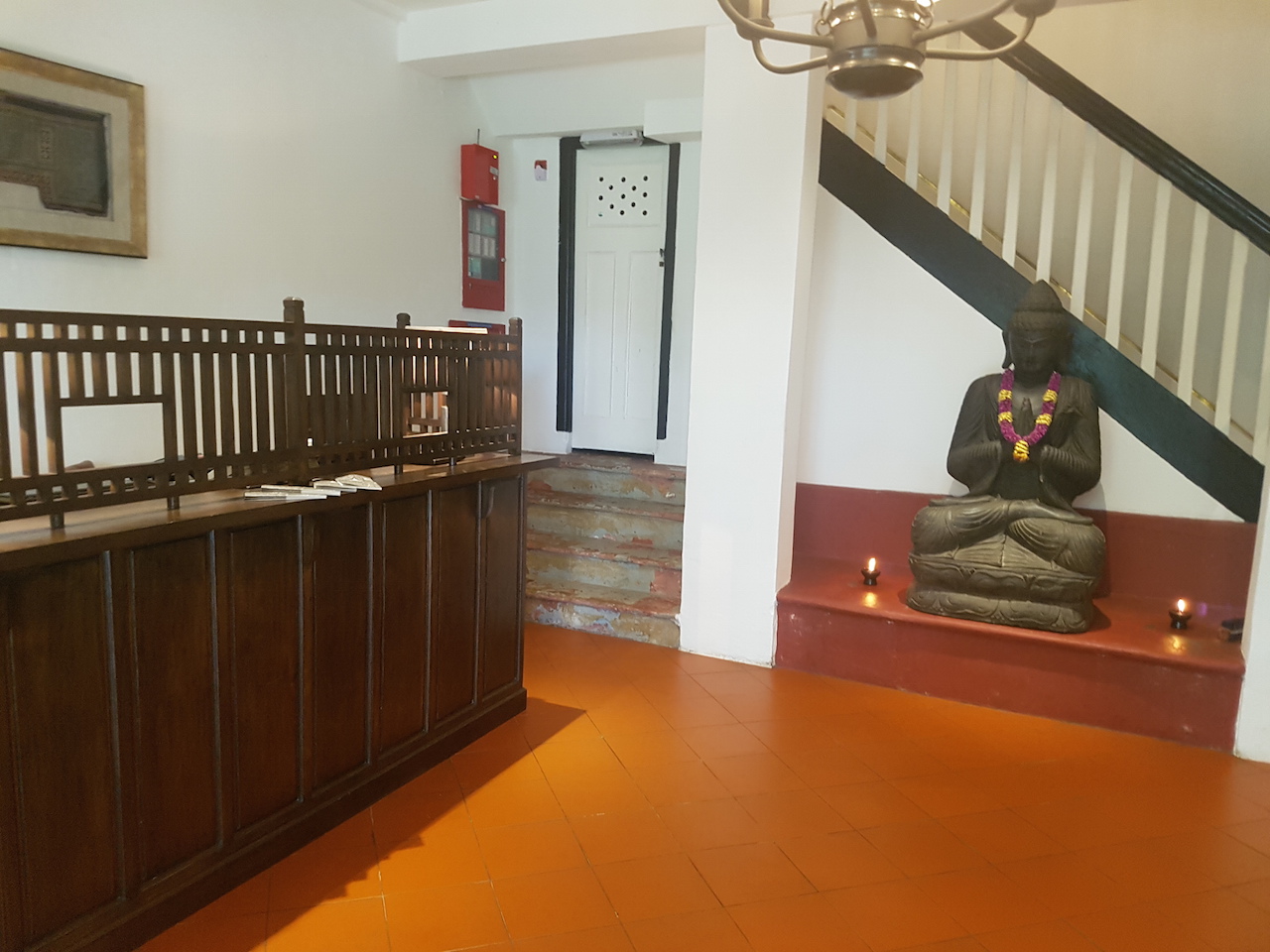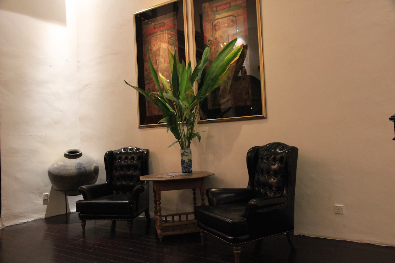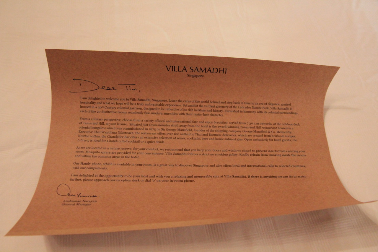 Als wir mit dem Taxi vorfuhren, wurden wir bereits erwartet. Man half uns mit dem Ausladen des Gepäcks und hieß uns herzlich willkommen. Die Villa Samadhi Singapur verfügt über keine pompöse Lobby, sondern vielmehr über einen kleinen Bereich, in dem die Formalitäten erledigt werden.