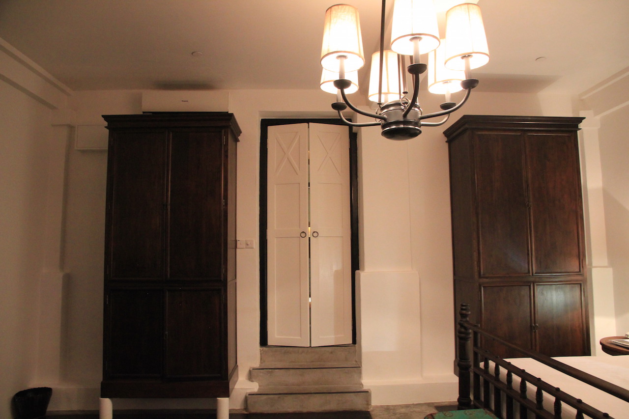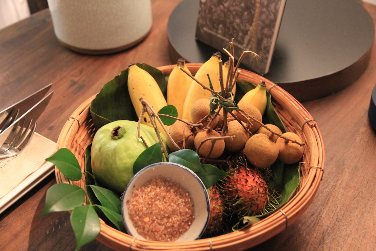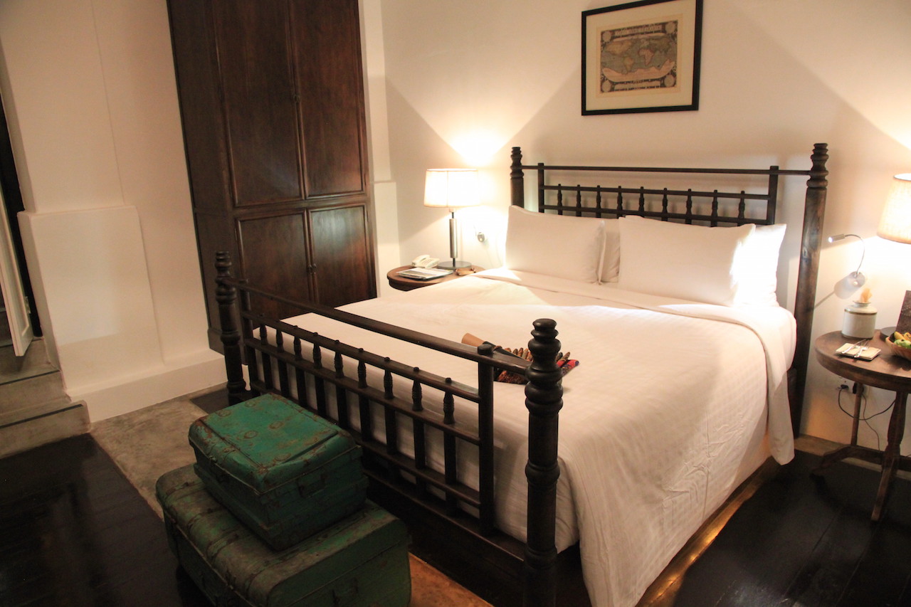 Links und rechts neben dem Bett befand sich jeweils ein Nachttisch mit Lampe und Steckdosen. Vor dem Bett lagen zwei alte, Metallkoffer, die als Ottomane dienten. Zudem wartete en kleiner Obstkorb auf uns. Für Gäste, die keine Simkarte haben, bietet die Villa Samadhi Singapur ein Handy an, welches der Gast mitnehmen kann.