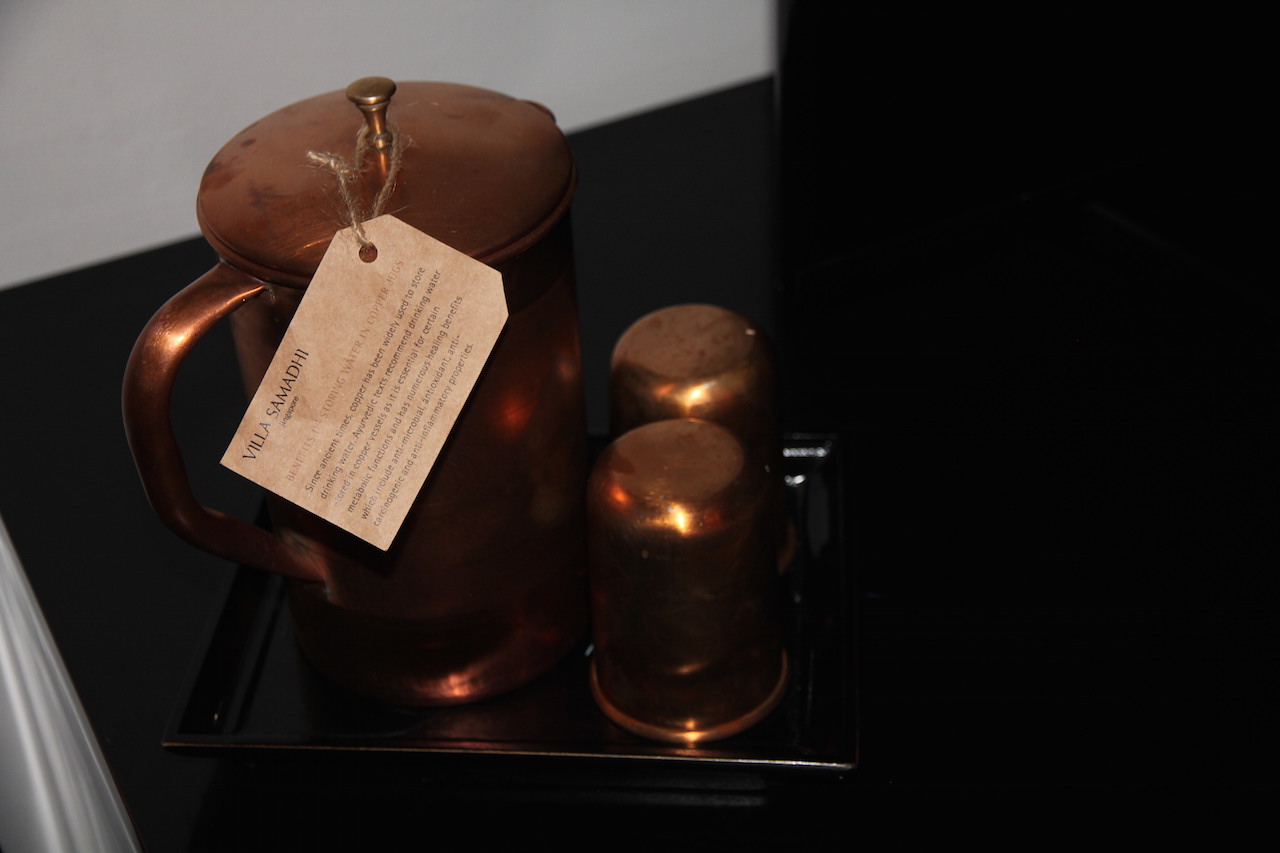 Gegenüber vom Bett befand sich eine große Kommode mit einem Fernseher. Da das Hotel Wert auf Nachhaltigkeit legt gab es hier auch kein Wasser in Plastikflaschen. Vielmehr wurde das Wasser in Kupferkannen serviert. Das hatte den angenehmen Effekt, dass das Wasser immer schön kühl blieb. Diese Liebe zum Detail gefällt mir persönlich außerordentlich gut.
