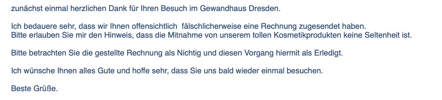 Drei Tage später war ich wieder Zuhause und im Briefkasten lag Post vom Gewandhaus. Ich war sicher, dass es sich entweder um ein Dankesschreiben oder ein Duplikat der Rechnung auf Papier handelt. Doch der Hoteldirektor hat mir aus einem ganz anderen Grund folgende Zeilen geschrieben: