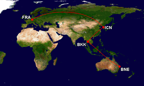 Ich haben schon fast eine emotionale Beziehung zu Asiana Airlines, denn kurz nach dem Start von Frankfurtflyer hat Asiana angekündigt mit Ihrem Airbus A380 von Seoul nach Frankfurt zu fliegen. Spätestens seit dem Erstflug des Asiana Airbus A380 nach Frankfurt habe ich eine regelrechte und schon fast ungesunde Vernarrtheit in den Asiana Airbus A380 und wollte diesen unbedingt einmal fliegen. Als sich für mich mehr oder weniger zufällig eine Option ergab, tat ich das Offensichtliche und flog von Brisbane über Bangkok nach Seoul um hier mit dem Asiana Airbus A380 in der First Class nach Frankfurt zu fliegen. Wie es zu diesem Trip kam und wie ich ihn für nur 115.000 Meilen und unter 50 Euro gebucht habe, könnt Ihr in der Einführung zu meinem Tripreport lesen.