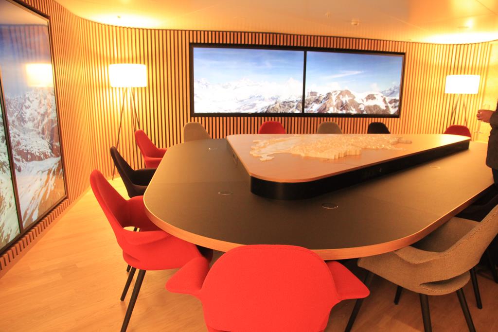 Hinter dem Bistrobereich befinden sich mehrere dutzend Sessel und Couchbereiche auf denen man es sich gemütlich machen kann. Direkt daneben befindet sich das Alpenstübli, eine Art Meeting oder Arbeitsbereich. Die Wände sind mit interaktiven Monitoren verkleidet, aber es gibt im Kontrast dazu auch Wände aus Stroh. In der Mitte des großen Tisches ist ein Relief der Schweizer Berge in den Tisch eingelassen. Außerdem gibt es kontaktlose Ladestationen für das Handy.