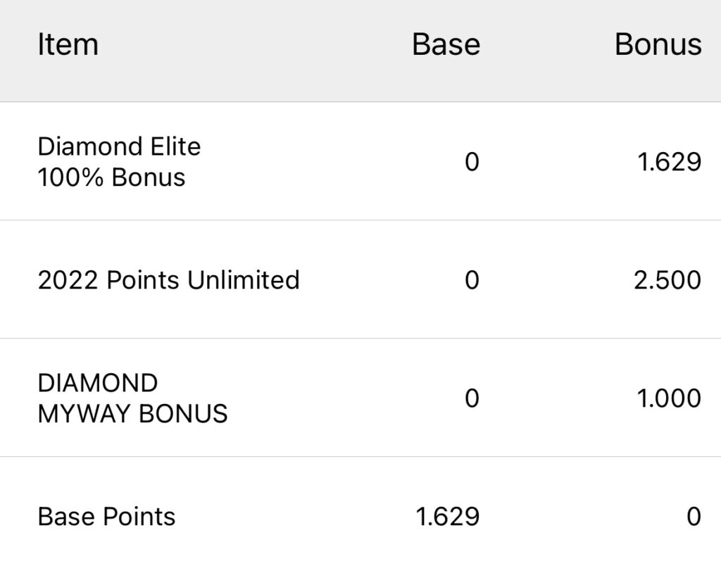Die Basis Punktegutschrifft wären 1.629 Punkte gewesen, hinzu sind noch einmal 1.629 Punkte Diamond Bonus gekommen, 1.000 Punkte Diamond Welcome Bonus und 2.500 Punkte für die Nacht Extra mit der aktuellen Promotion.
