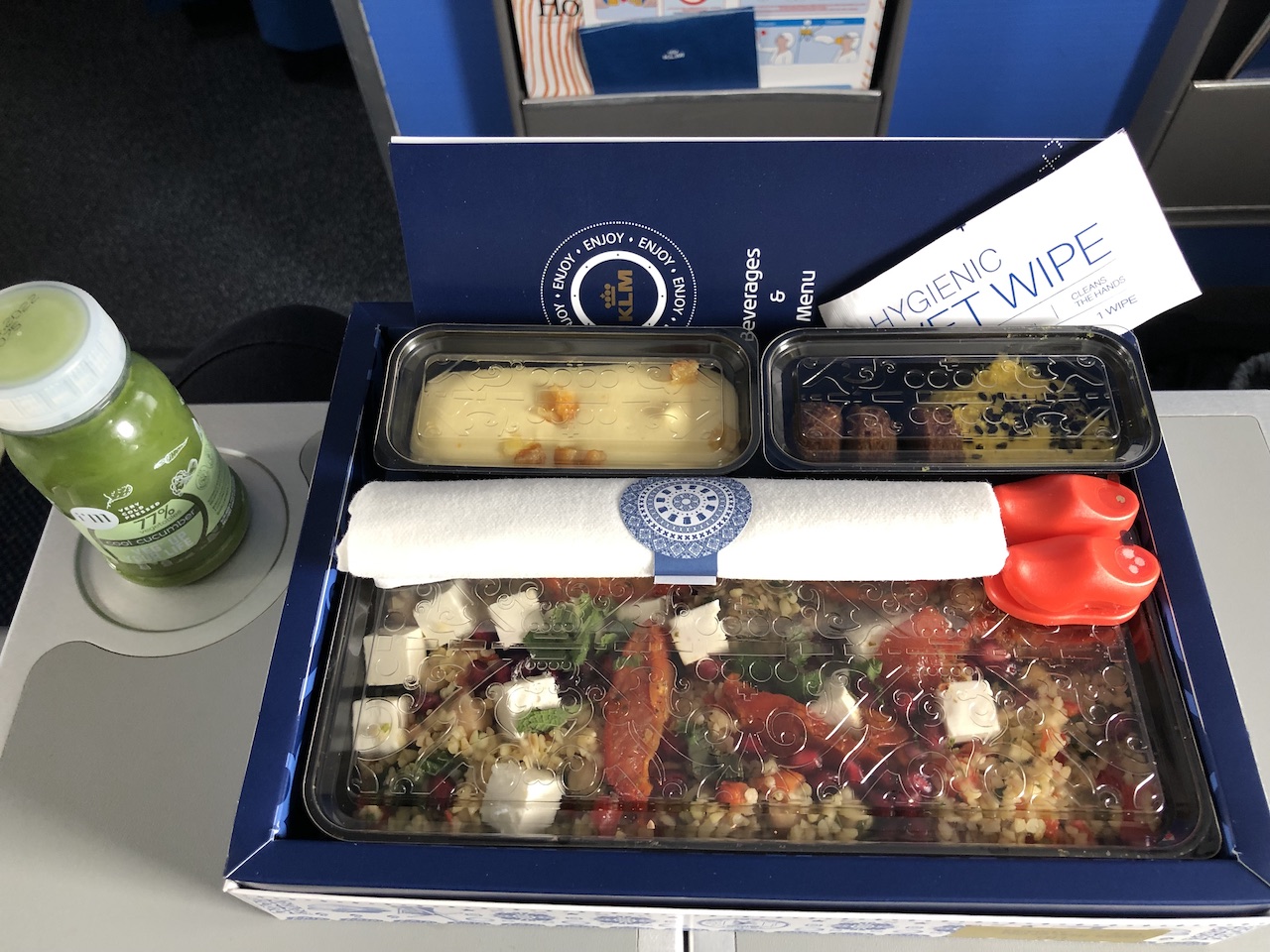 Denn ich fühle mich immer in C ziemlich verarscht. Wie beschrieben, genau die gleichen Sitze wie in Y. Willkommen drink ist eine 0,3l Flasche stilles Wasser. Dass Biz Essen besteht aus einer Salatschale von FoodMaker. Oftmals die vegane Ausgabe, auch wenn keine Sonderverpflegung bestellt wurde. Genau die gleiche Ware, die es in Brüssel in jedem Delhaize Supermarkt für 4,99 Euro gibt. Frühstück auf manchen Strecken ein in Plastik eingeschweister Muffin, der aus einer Pappkiste gereicht wird. Kein Kabinentrenner.
