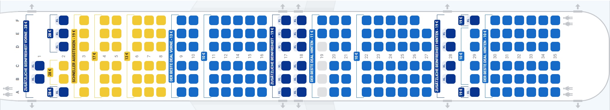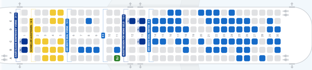 Das neue Boeing-Modell ist bei unserem Billigflieger bis zur 35. Sitzreihe bestuhlt. Es fehlt jedoch eine Reihe 13 und auf der rechten Seite die Reihe 1.