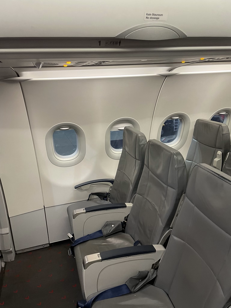 Ja, Ihr lest richtig. Durch die Krümmung des Flugzeugs gibt es in Reihe 1 mit Sitz 1B und 1C nur zwei Sitze. Perfekt also für Pärchen und quasi mit unlimitierter Beinfreiheit.