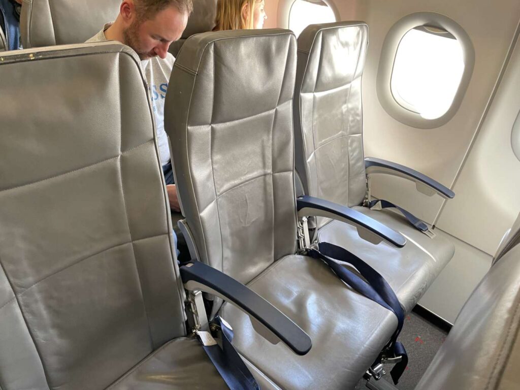 Aber auch hier habt Ihr diese typischen Sitze, bei denen sich die Armlehne nicht hochklappen lässt, weil der Tisch darin verbaut ist.