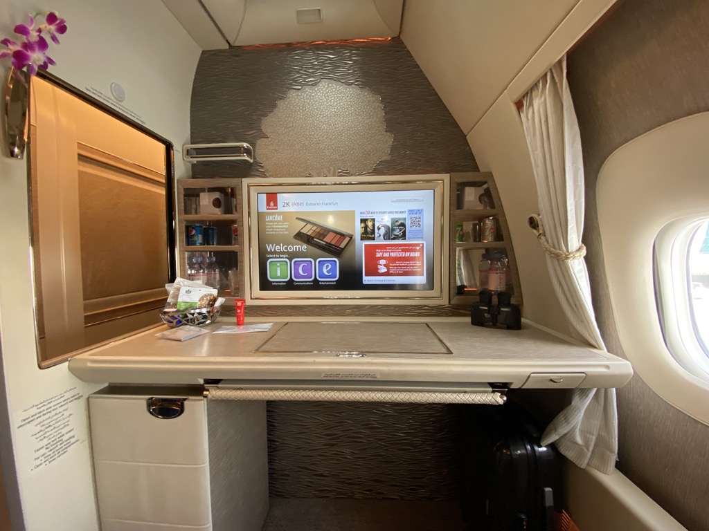 Man beachte die hohen Griffe für die Türe. und die Gestaltung der Decke über der Sitze. Dazu ist auch ein frappierend ähnlicher Monitor zur Kontrolle des Sitzes bei Lufthansa an der Wand, exakt wie in der neuen Emirates First Class.