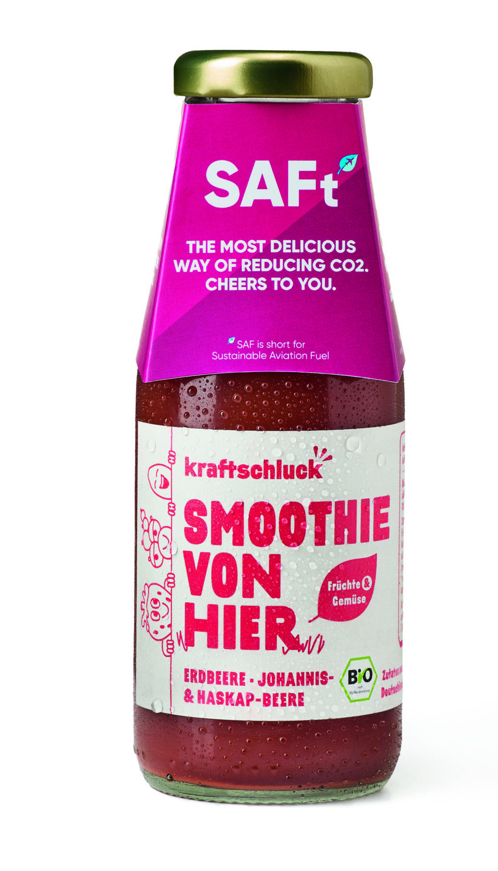 - Kompensation mit dem 19,50-Euro-Smoothie: Der „SAFt“-Smoothie soll durch SAF-Einsatz und Klimaprojekte den CO₂-Ausstoß eines Flugs kompensieren.