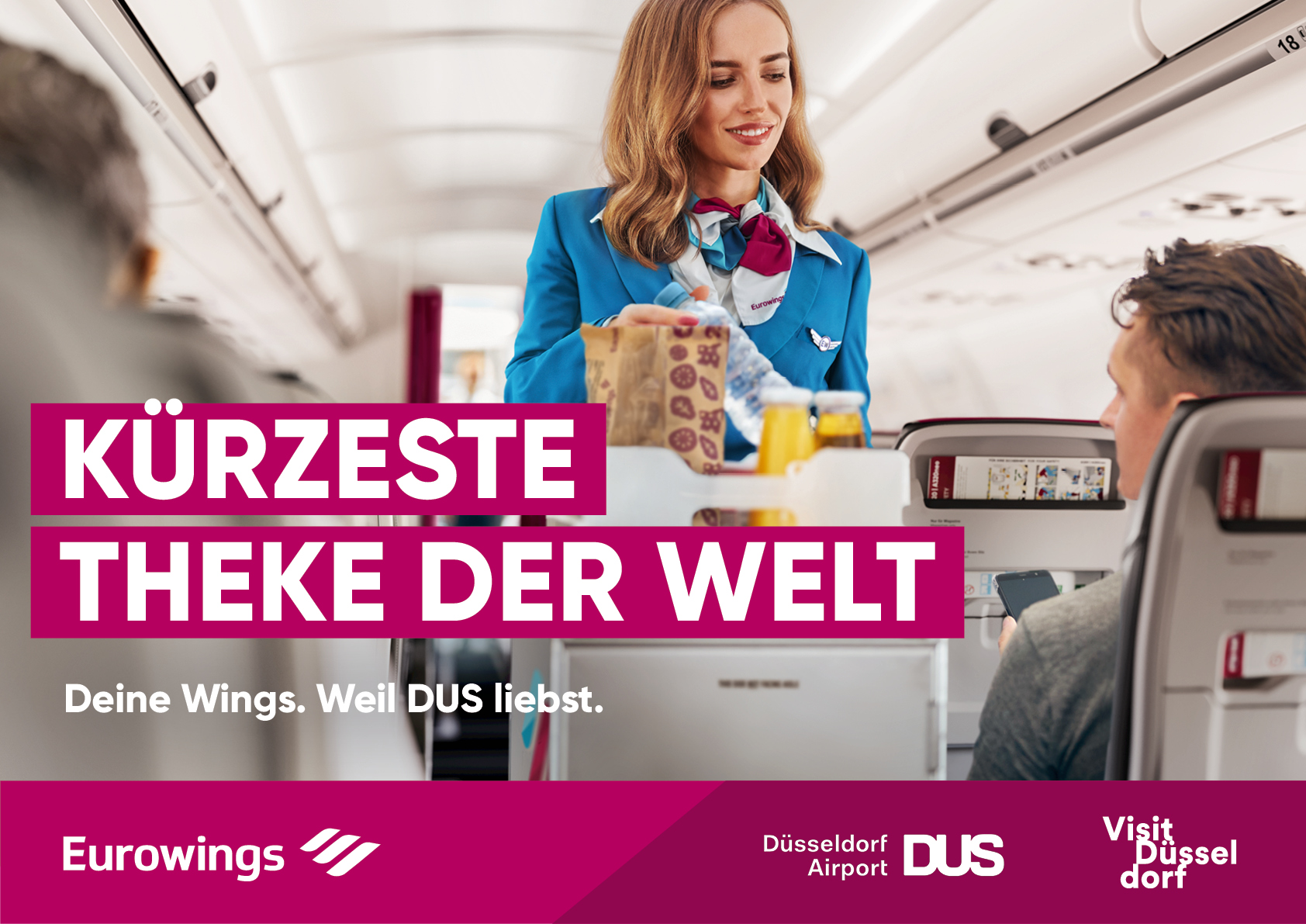 Der Flughafen Düsseldorf (DUS) und Eurowings haben eine neue Kampagne kreiert, unter dem Motto „Deine Wings. Weil DUS liebst“ will man die Verbindung zwischen dem Airport und den Bewohnern der Stadt schaffen. Man hat mehrere Motive mit lustigen Sprüchen versehen, diese werden in den kommenden Wochen im Stadtgebiet auf Postern und Infoscreens zu sehen sein. Eurowings ist der Platzhirsch am Flughafen der Stadt, dort sind über 30 Maschinen der Lufthansa Tochter stationiert.
