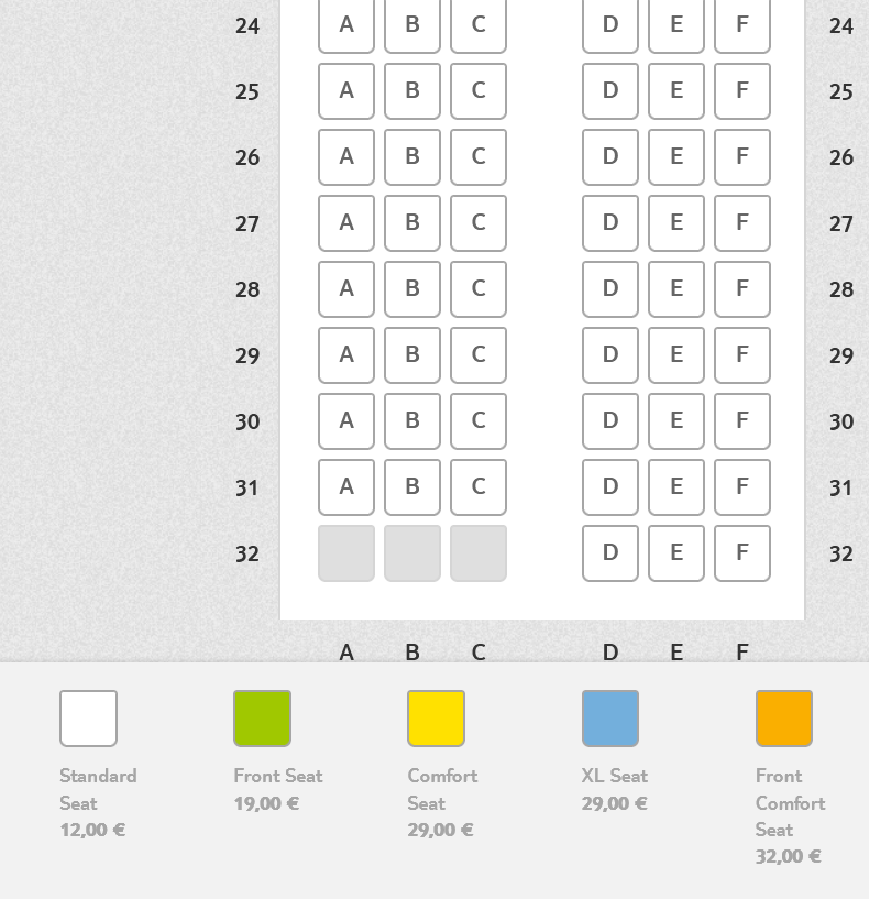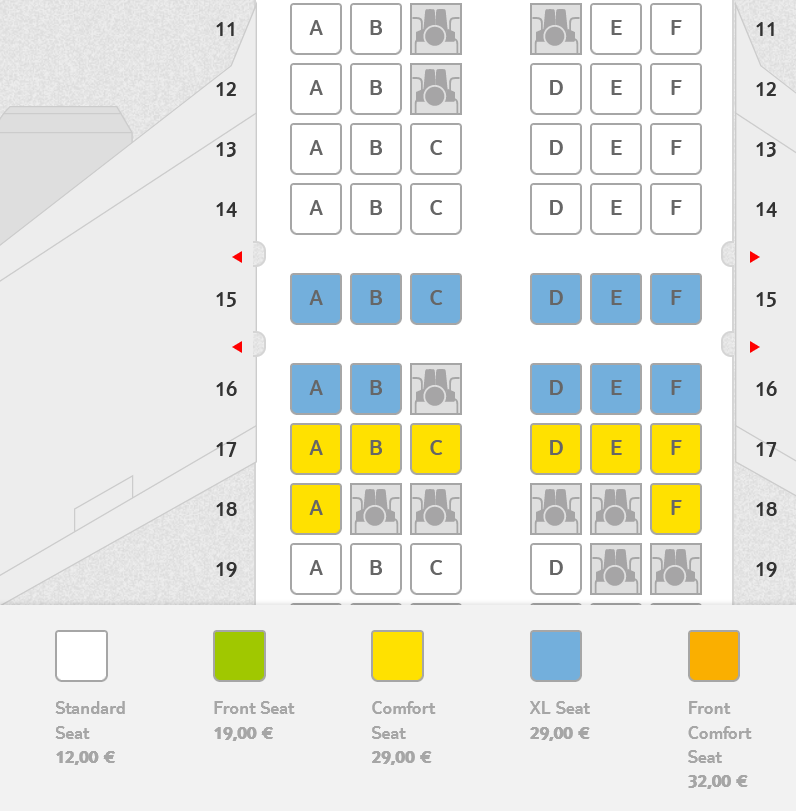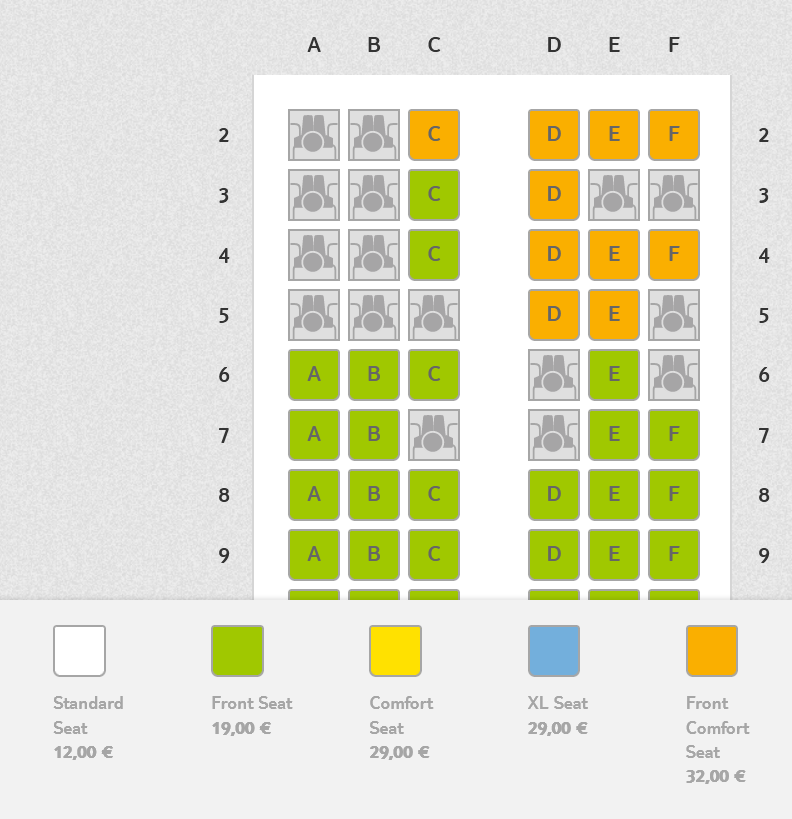 Im Flugzeug befinden sich 186 Economy Class Sitze. Davon sind 12 Comfort Sitze. Diese bieten 11cm mehr Beinfreiheit und kosten auf dem Flug nach Mallorca jeweils 29 Euro bei Vorabreservierung. Die zwölf XL-Sitze an den Notausgängen kosten ebenfalls 29 Euro bei Vorabreservierung. In den vorderen Reihen (2-9) kostet einer der 39 sogenannten „Front Seats“ jeweils 19 Euro. Am teuersten sind die „Front Comfort Seats“, von denen es 15 gibt. Sie kosten jeweils 32 Euro. Wer sich vorab einen „normalen“ Wunschsitzplatz sichern möchte, kann das für 12 Euro erledigen.