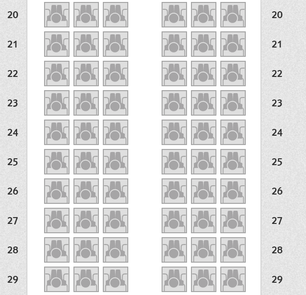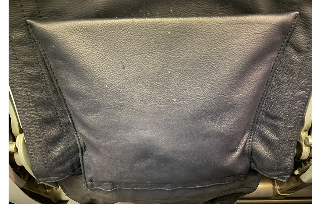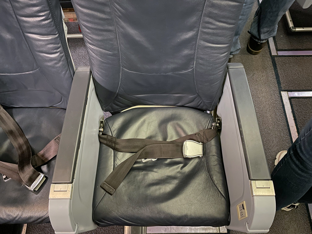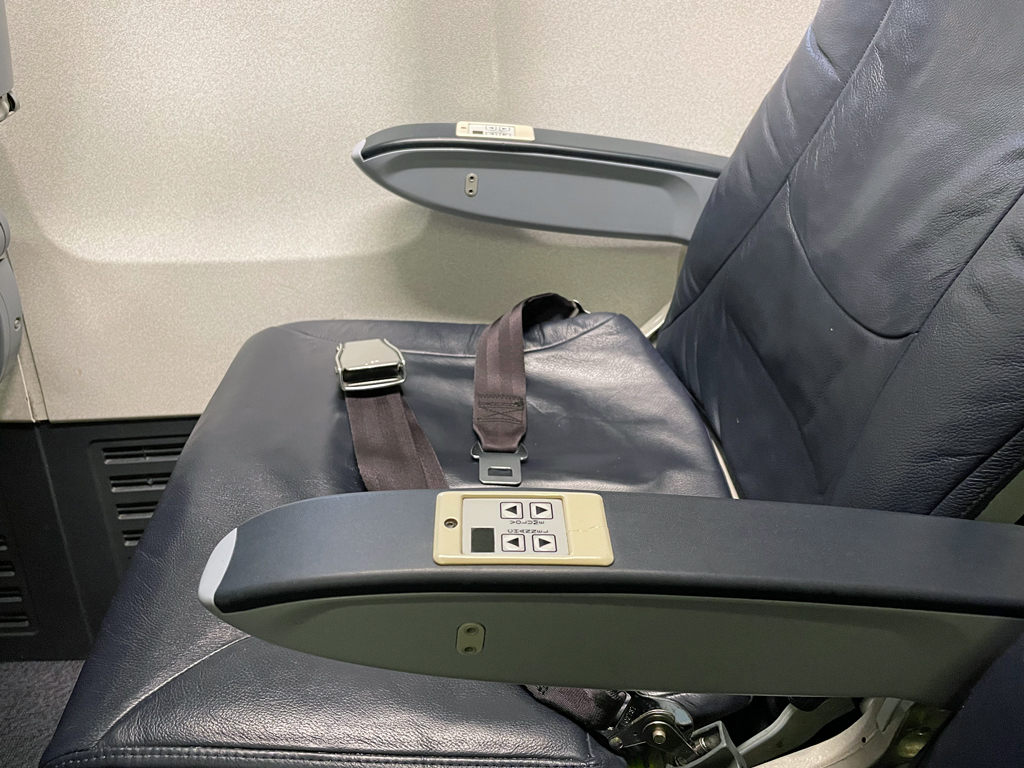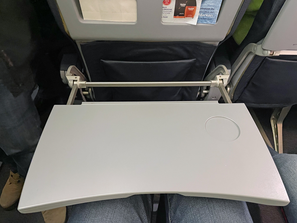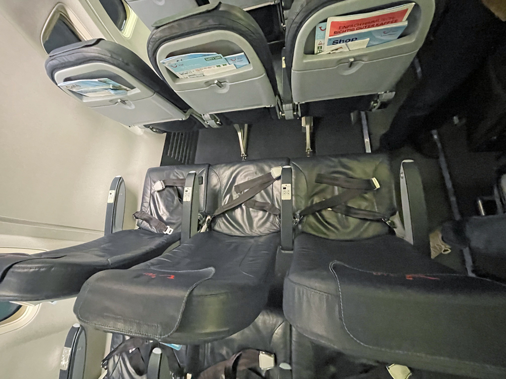 Ansonsten herrscht auf den schmucklosen Kunstledersitzen in Dunkelblau große Uniformität. Man sieht den Sitzen an, dass sie häufig verwendet wurden, jedoch wirken sie nicht abgenutzt. In den vordersten Reihen und an den Notausgängen sind die Armlehnen fixiert und durchgängig. Außerdem befinden sich die ausklappbaren Tische in ebendiesen Armlehnen. Ansonsten lassen sich die Armlehnen nach oben wegklappen und die Tische befinden sich an der Rückenlehne des Vordersitzes.