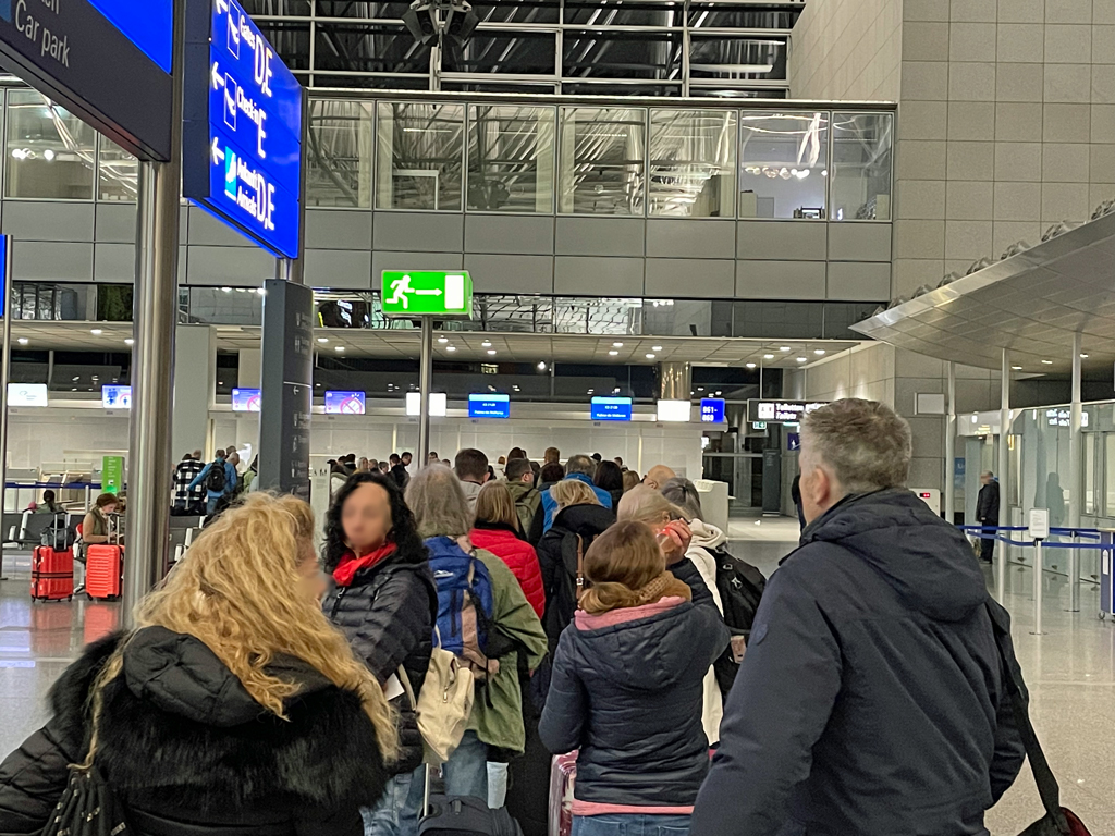 Da ich online eingecheckt hatte konnte ich mit meiner elektronischen Bordkarte direkt zur Sicherheitskontrolle im Terminal 2 in Frankfurt gehen. Da ich allerdings früh am Flughafen war, ging ich kurz zu den Check-in Schaltern von TUIfly. Und die waren für die Tageszeit schon gut besucht. Klar, viele auf dem TUIfly Flug sind auf dem Weg in den Urlaub und Mallorca ist im März noch nicht ganz so sommerlich. Daher möchten viele Reisende Gepäck aufgeben und dann bilden sich schnell Schlangen.