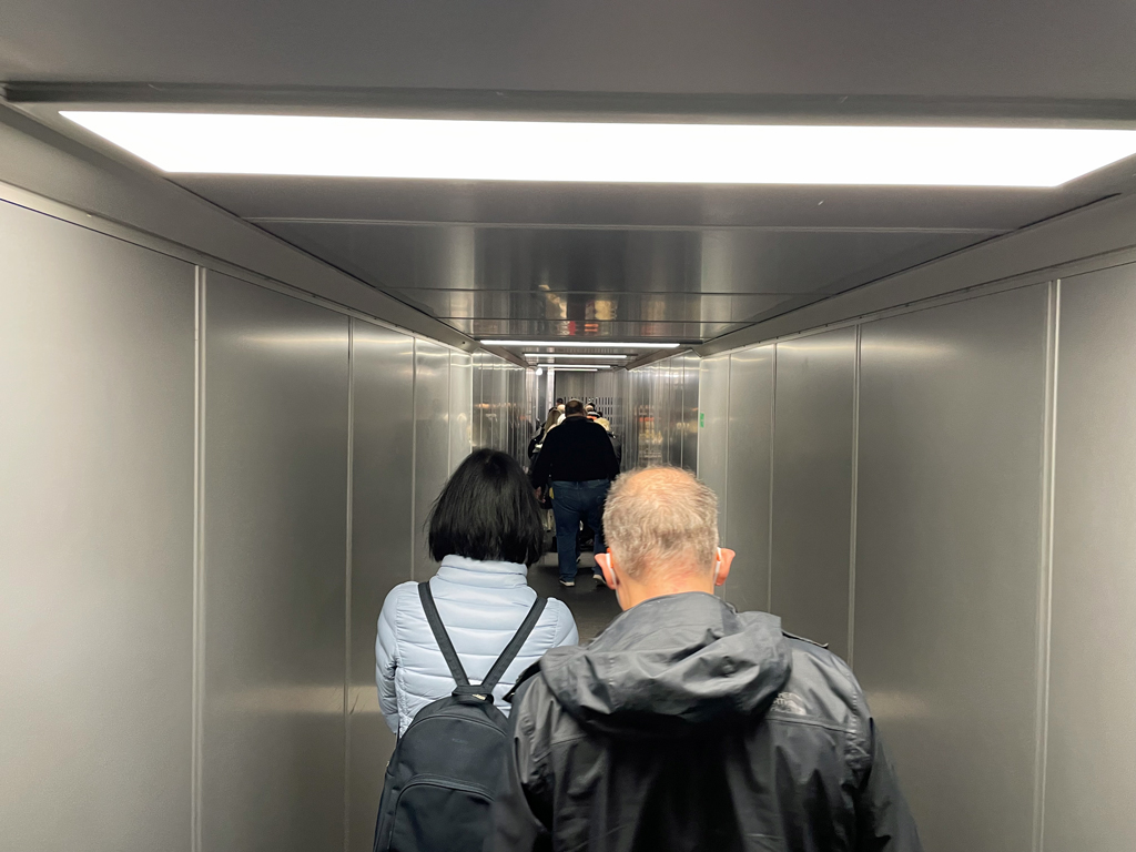 Dort erfolgte der erste Aufruf zum Boarding um 5:37 Uhr, wobei der Boardingprozess erläutert wurde. TUIfly bordet die Flugzeuge nach Sitzreihen von hinten nach vorne. Dementsprechend wurden zunächst die Reihen 34-24 aufgerufen. Nur 2-3 Minuten später folgten die Reihen 34-14. Damit war auch ich an der Reihe. Ich gehe davon aus, dass der Aufruf für die restlichen Reihen sehr kurzfristig danach erfolgte, denn in der Brücke zum Flugzeug staute es sich bald noch viele Meter hinter mir.