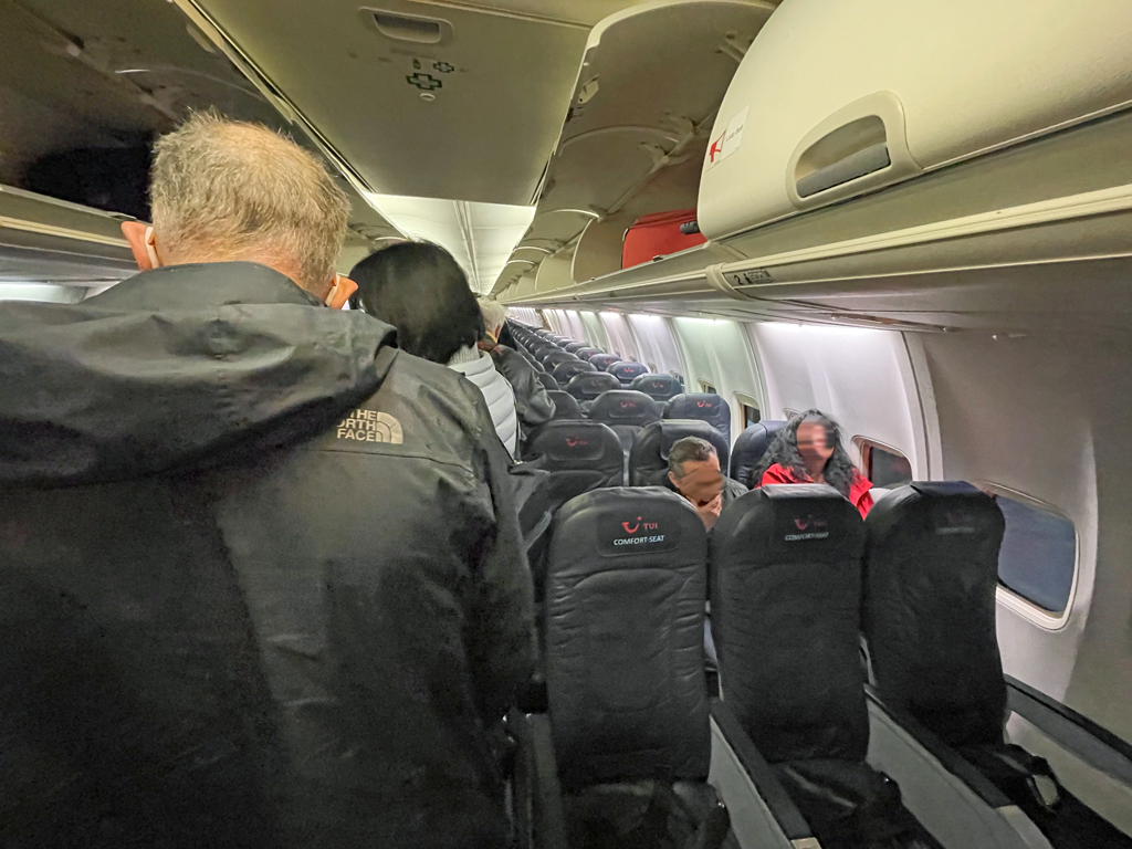 Was direkt auffällt: TUIfly ist ein Ferienflieger. So oft wie allen Passagieren ein schöner Urlaub gewünscht wird, ist schon bemerkenswert. Mit einer reinen Economy-Bestuhlung und einem reinen Point-to-Point-Service bemerkt man schon große Unterschiede zu Lufthansa. Das Boarding lief absolut gesittet ab, die Einteilung nach Reihen ist leicht verständlich und intuitiv. Da es auch keine Statuskunden usw. gibt, hat das ganze schon etwas von Gleichmacherei.