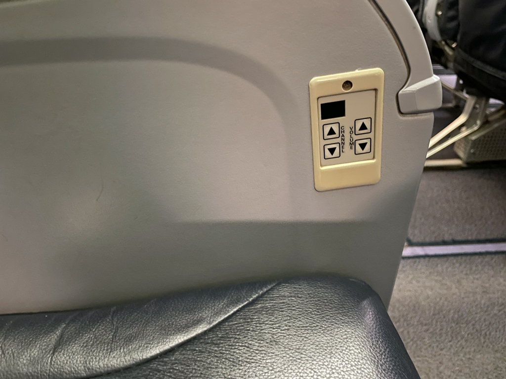 An den Sitzplätzen befinden ich Steuerungselemente für ein Unterhaltungssystem und Kopfhörerbuchsen (2×3,5mm). Wahrscheinlich war einmal vorgesehen, den Passagieren darüber Unterhaltung auf mehreren Kanälen zur Verfügung zu stellen. TUIfly bietet diese Art der Unterhaltung jedoch nicht mehr an.
