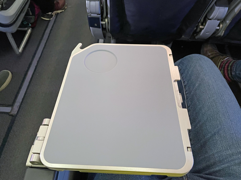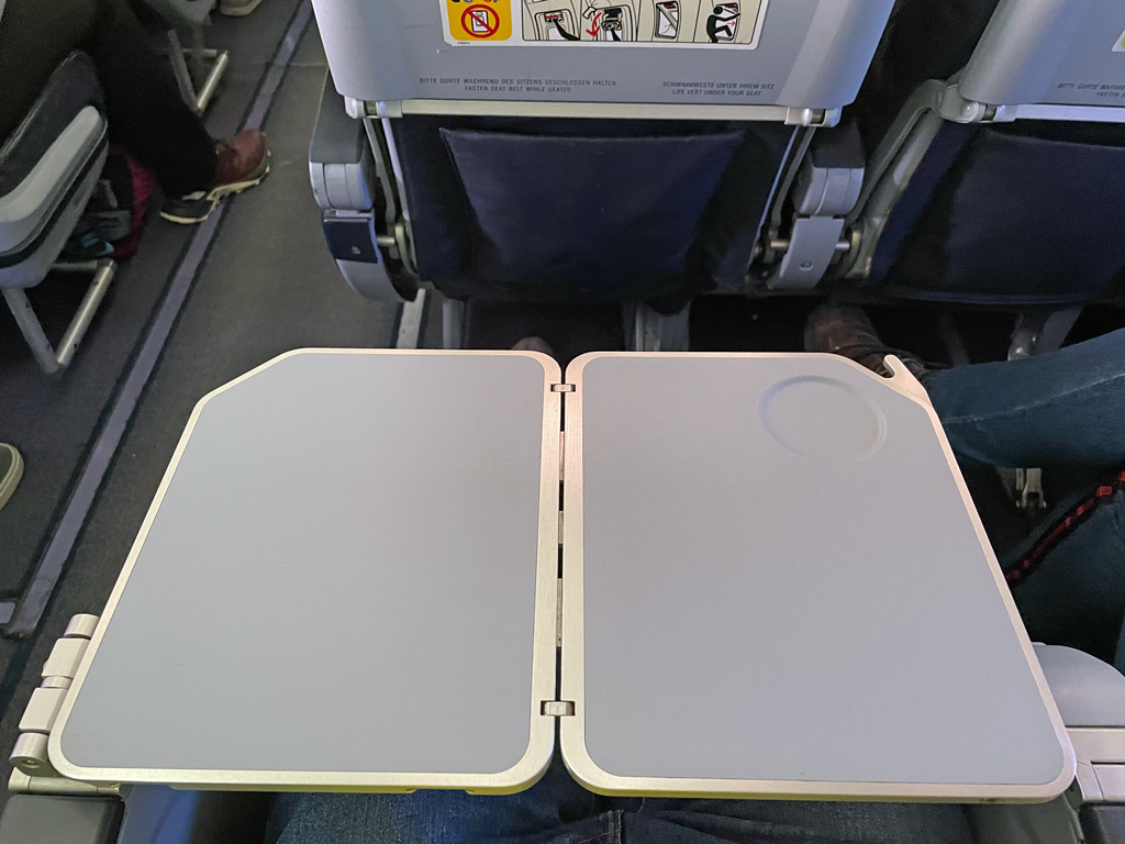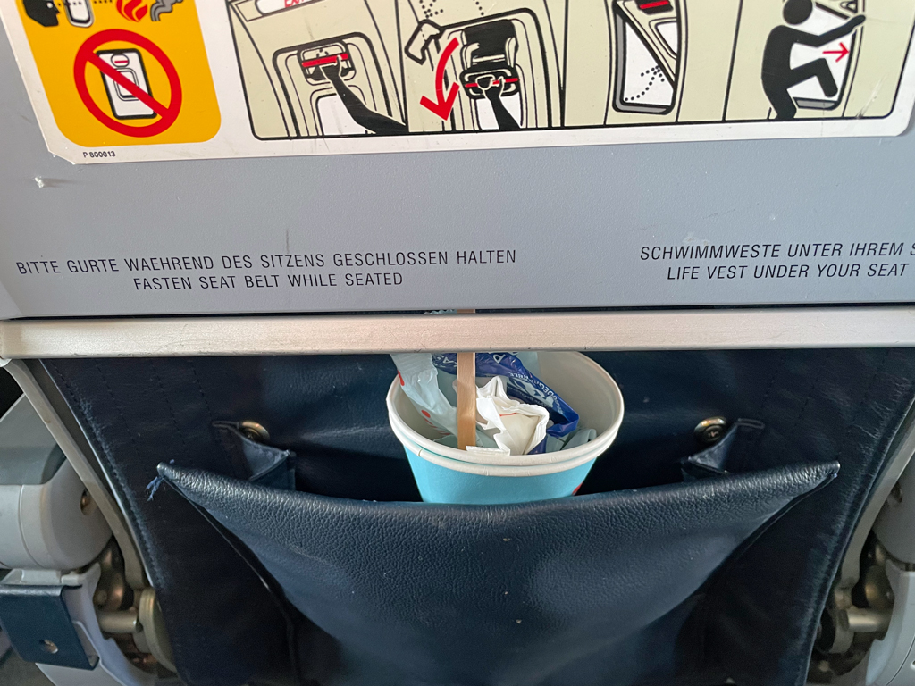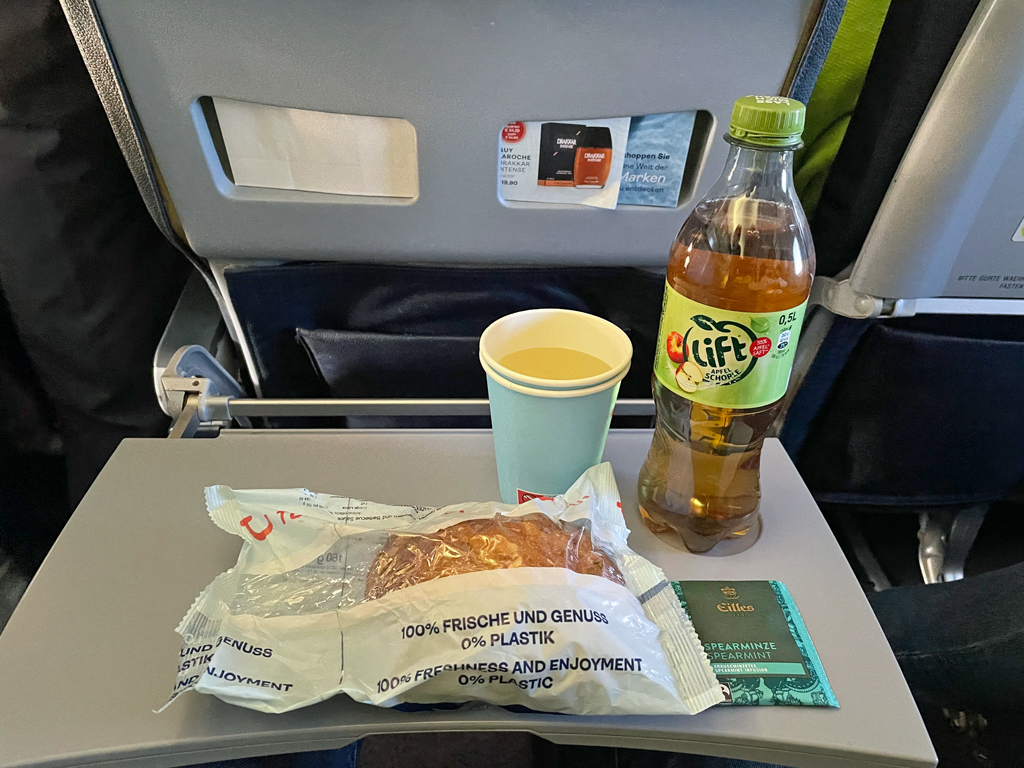 Mit der Qualität meines Menüs war ich zufrieden. Allerdings muss man die üblichen Abstriche zwischen Marketingsprech und tatsächlichem Essen machen. Statt eines „Pulled Krachers“ (Was ein Name!) erhielt ich ein leicht angeweichtes Brötchen. Aber das kann die Airline bei einem abgepackten belegten Brötchen auch kaum anders lösen. Die Lift Apfelschorle und der Tee waren jedenfalls vollkommen auf Par mit ebendiesen Getränken am Boden.
