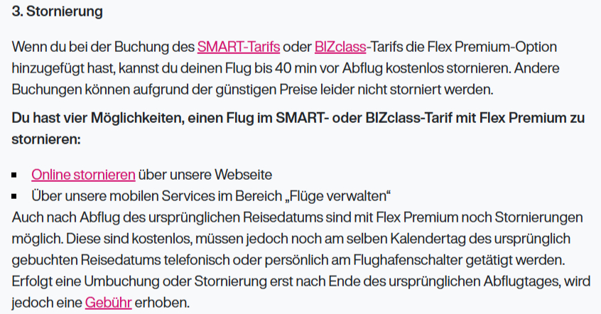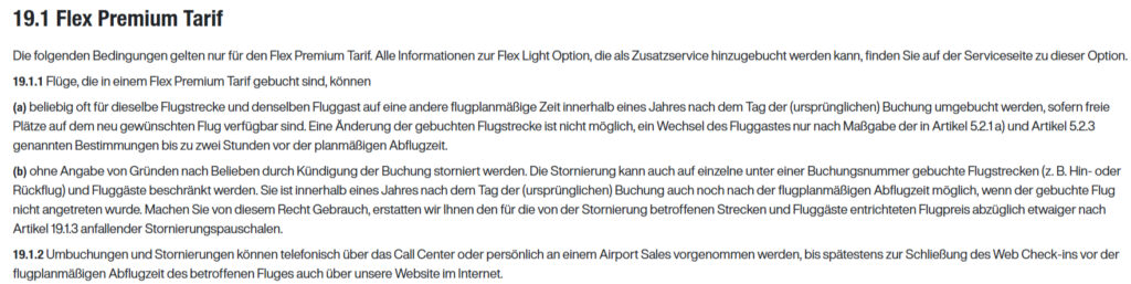 Im Grunde genommen ist es aus Kundensicht völlig egal, was auf einzelnen Webseiten eines Unternehmens steht. Relevant sind die Allgemeinen Geschäftsbedingungen (AGB) oder im Fall von Fluggesellschaften die ABB. Und die sehen bei Eurowings in Bezug auf den Flex-Premium-Tarif so aus: