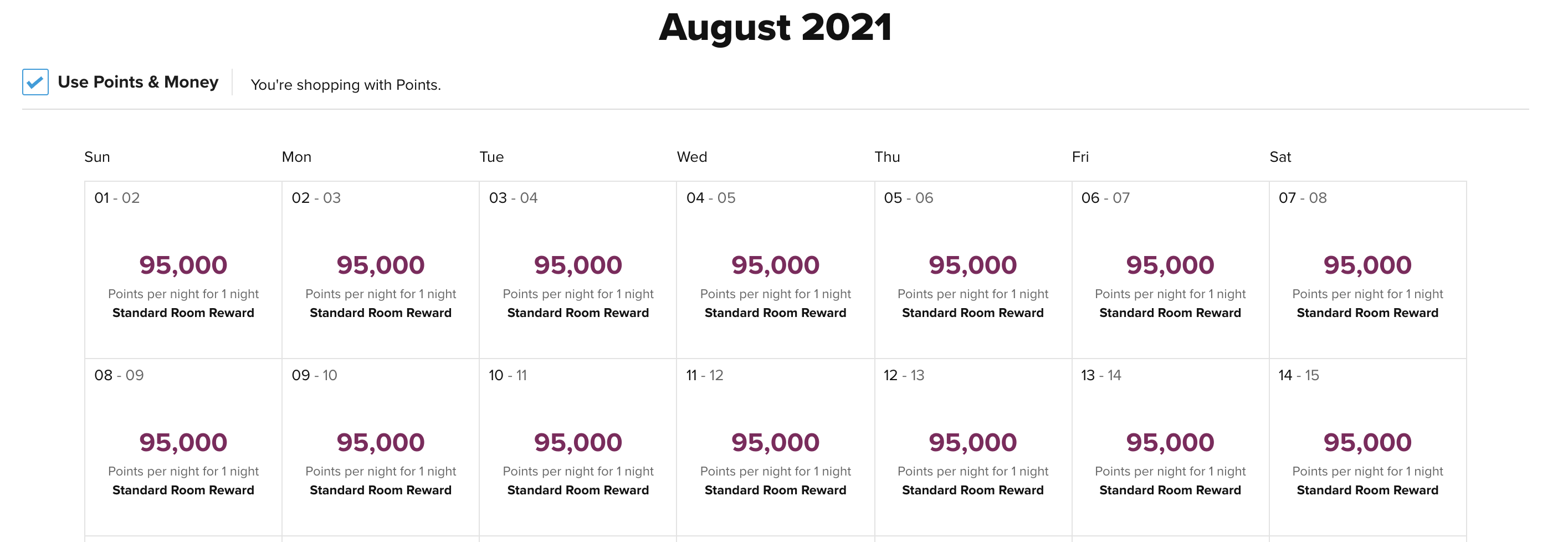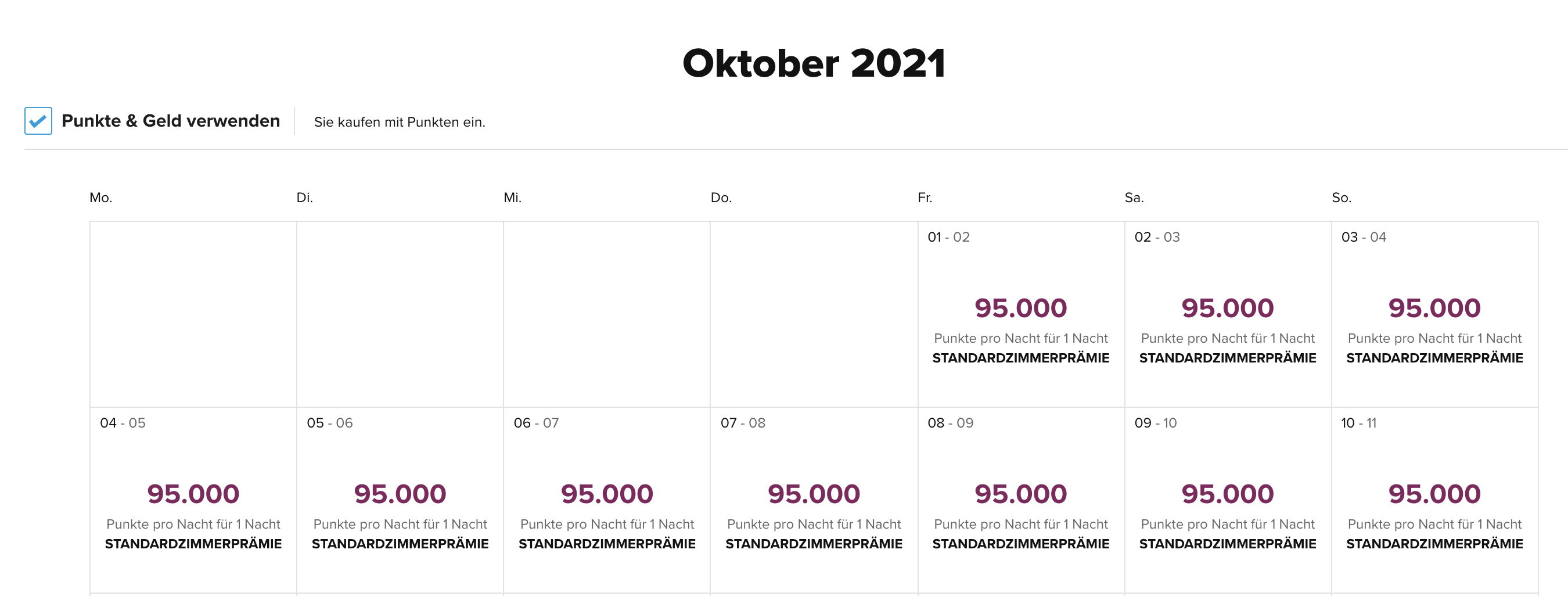 Für Übernachtungen im August werden Preise um die 1.000€ abgerufen. Gleichzeitig sind an jedem einzelnen Tag Prämiennächte verfügbar. Diese kosten 95.000 Punkte, die man durch die aktuelle Promo für 395€ kaufen kann. (48.000 Punkte = mit Bonus 96.000 Punkte für 480$)