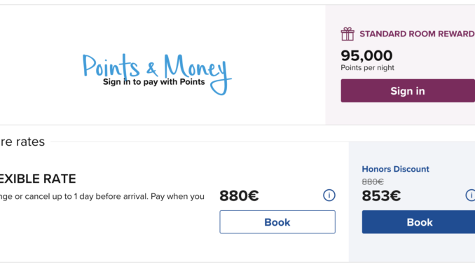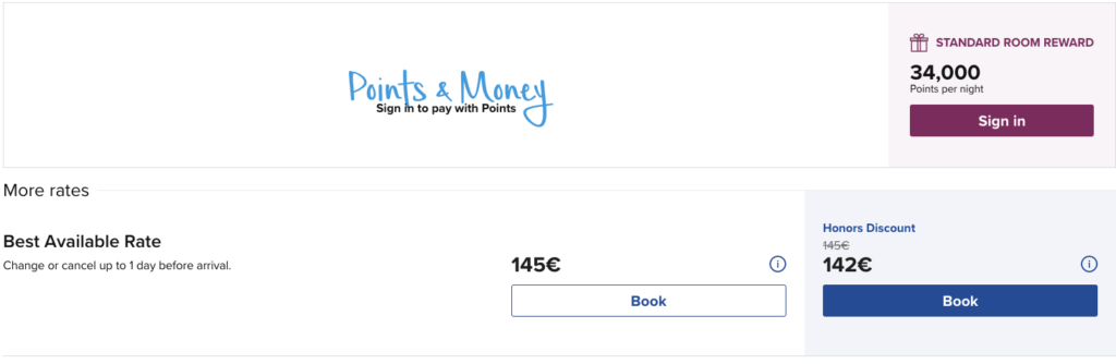 Hier ein Beispiel des Hilton Berlin, an dem man diesen Unterschied erkennen kann. Eine Übernachtung kostet für den aktuellen Tag 34.000 Punkte oder 142€.