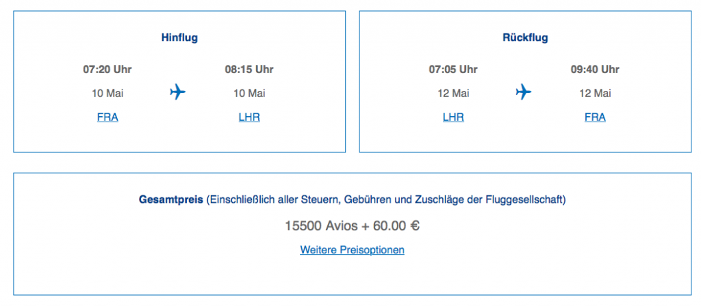 Ein Hin- und Rückflug in der Business Class von Frankfurt nach London kostet z.B. 15.500 Avios und 60 Euro an Steuern und Gebühren. Auch wenn man sich über die Nötigkeit einer Business Class auf dieser Strecke streiten kann, würde dieser Flug wenn man ihn mit Geld bezahlt, immerhin bis zu 900 Euro kosten.