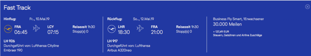 Alternativ könnt Ihr für 30.000 Meilen auch einen Hin- und Rückflug in der Lufthansa Business Class zu einem beliebigen Ziel in Europa als FlySmart Prämie buchen. Das Meilenschnäppchen nach Dubai bietet zwar den höheren Mehrwert, aber mit der FlySmart Prämie kommt man schneller zum Erfolg.