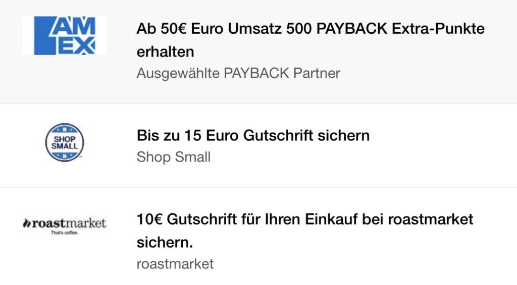 Zusätzlich bietet die Karte weitere Vorteile wie zum Beispiel unbegrenzte Punktegültigkeit, eine einfache Nutzung mit Apple Pay und die AMEX Offers, mit denen Ihr weitere Punkte generieren oder eine Geldgutschrift bei bestimmten Partnern bekommt. Diese können sich je nach Nutzer unterscheiden, hier eine Teil meiner aktuellen Offers:
