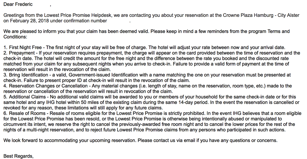 Am nächsten Morgen fand ich dann folgende E-Mail von IHG in meinem Postfach, in der mir mitgeteilt wurde, dass man meinen Claim akzeptieren würde, ich also kostenfrei in der Hansestadt nächtigen dürfte.