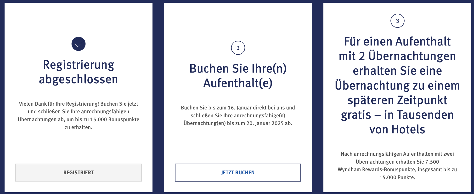 Es gilt so gut für jedes Programm: Wir raten Euch dazu, Punkte zu sammeln und vor allem die Bonuspunkte aus den Promos mitzunehmen. Das gilt gerade für Wyndham, auch wenn der Rewards Programm nicht unbedingt herausragend ist. Wer einen Aufenthalt plant, könnte bei der Kette schon nach 2 Nächten eine Freinacht mitnehmen.