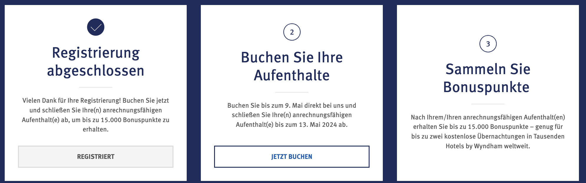 In der ersten Woche gibt es bis zu 15.000 Bonuspunkte, diese bedeuten einen Gegenwert von bis zu zwei Freinächten. Diese werden in zwei Schritten gutgeschrieben. Nach zwei Nächten gibt es 7.500 Extrapunkte. Jedes Mitglied darf dies maximal zwei Mal nutzen, unterm Strich kann man mit 4 Nächten also 15.000 Punkte abstauben.