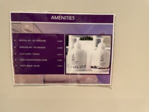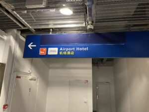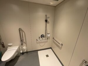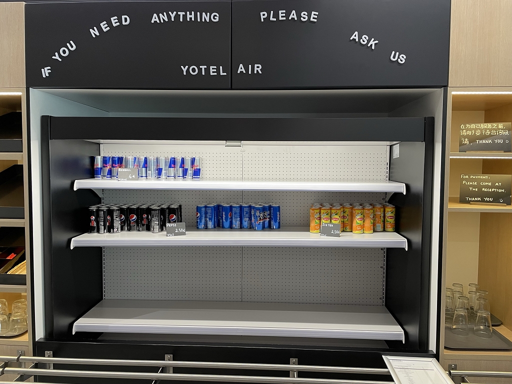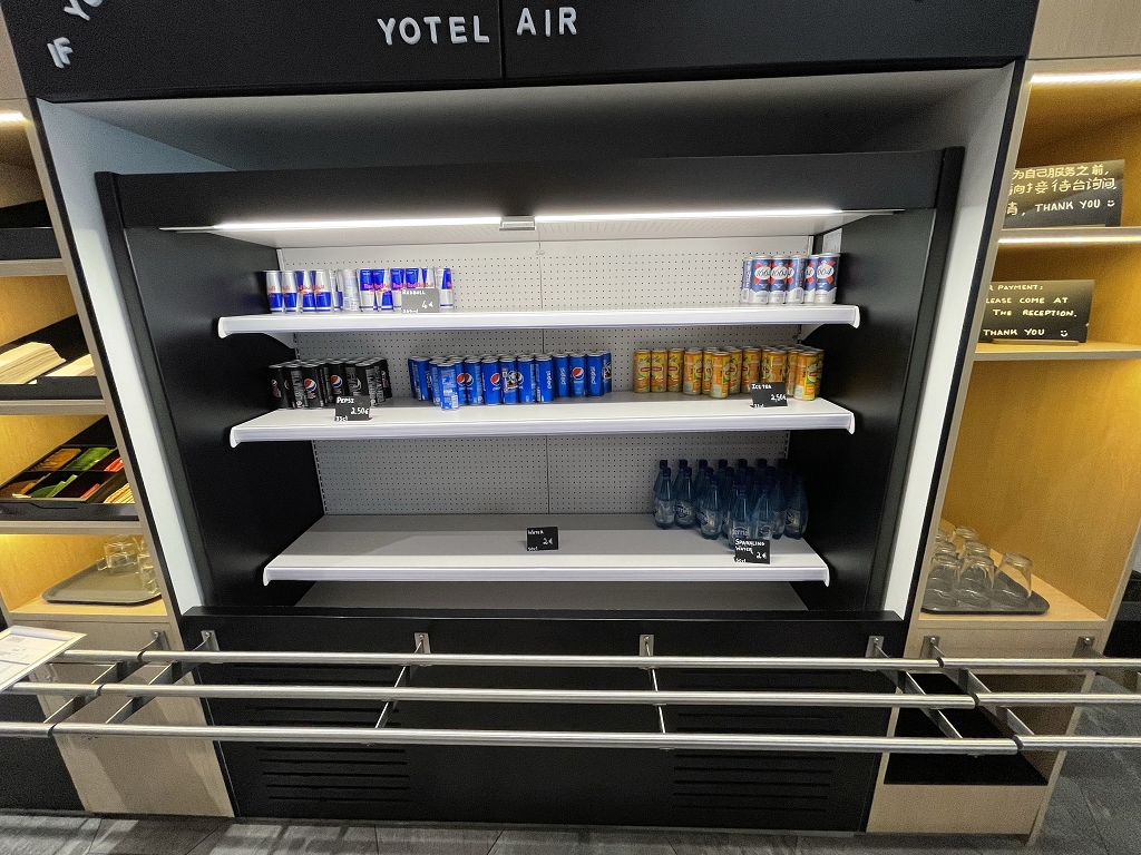 Durch weitere Schiebetüren gelangt man in den Hotelbereich des Yotel Air. Hier befinden sich weitere Toiletten und Duschen. Die Benutzung der Duschen muss am Front-Desk angefragt werden. Wenn eine Dusche frei ist, wird man zur Dusche begleitet und diese wird dann aufgeschlossen. Nach Benutzung ist die Dusche bis zum Abschluss der Reinigung gesperrt.