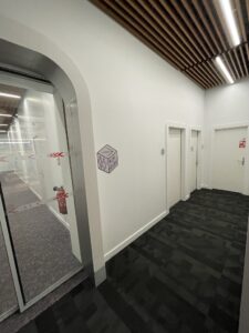 Dahinter liegt die Lobby/Lounge. Man geht direkt auf das Stehpult der Lobbyaufsicht zu. Hinter diesem Stehtisch befinden sich Tische mit Stühlen und eine lange Bank.