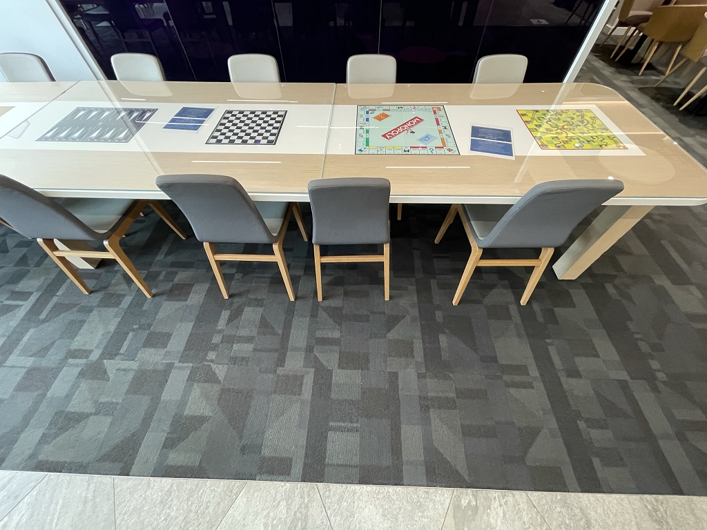Wenn man weiter in die Richtung geht, gibt es einen Bereich mit hohen Tischen und einem langen Tisch. Dieser eignet sich z.B. zum Arbeiten oder auch für Gesellschaftsspiele, deren Spielfelder unter der Glasplatte zu sehen sind. Man muss halt Glück haben, dass das gewünschte Spielbrett gerade frei ist. Wahrscheinlich kann man die Spielfiguren und Würfel bei der Lobbyaufsicht ausleihen. Aber dafür muss diese erst einmal anwesend sein.