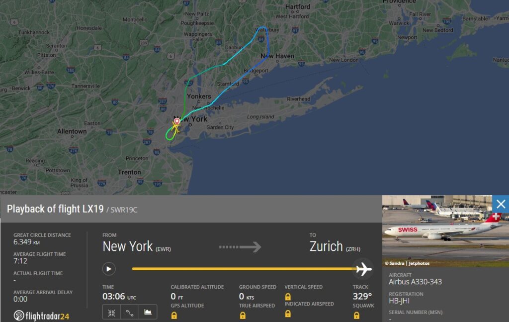 Doch dort kam Flug LX19 nicht an. Bereits kurz nach dem Start auf einer Flughöhe von 21.000 Fuß kehrte der A330 um und landete wieder am Flughafen EWR. Das Flugzeug landete nur eine Stunde und 13 Minuten später wieder am selben Flughafen. Grund war anscheinend ein Passagier, der an Bord ausgerastet war.