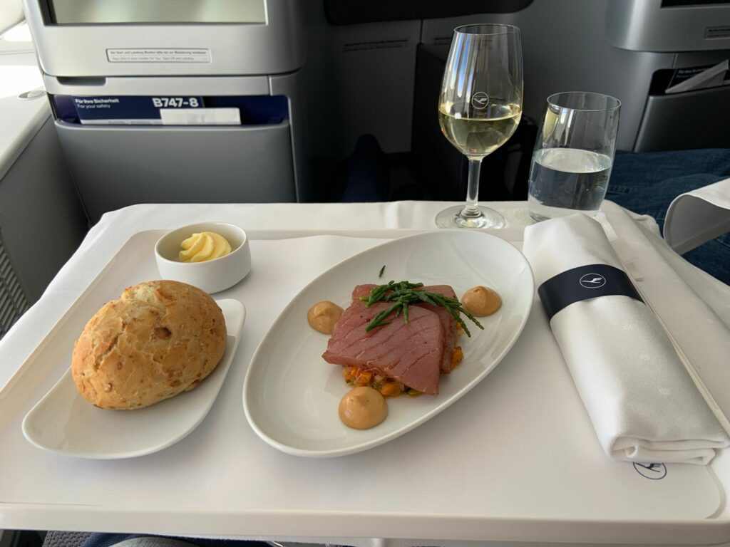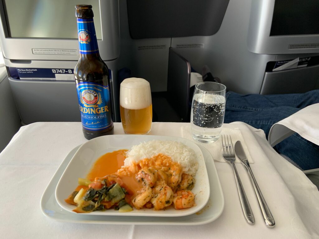 Die oft bemängelte Qualität der Speisen bei Lufthansa kann ich auf diesem Flug nicht bestätigen. Natürlich bieten Konkurrenten wie Qatar oder Etihad ein besseres Catering, persönlich war ich jedoch von den Speisen begeistert. Denn mein Thunfisch zur Vorspeise hatte ein angenehme Würze und auch die Garnelen in einer leckeren Curry-Sauce waren schön zart.