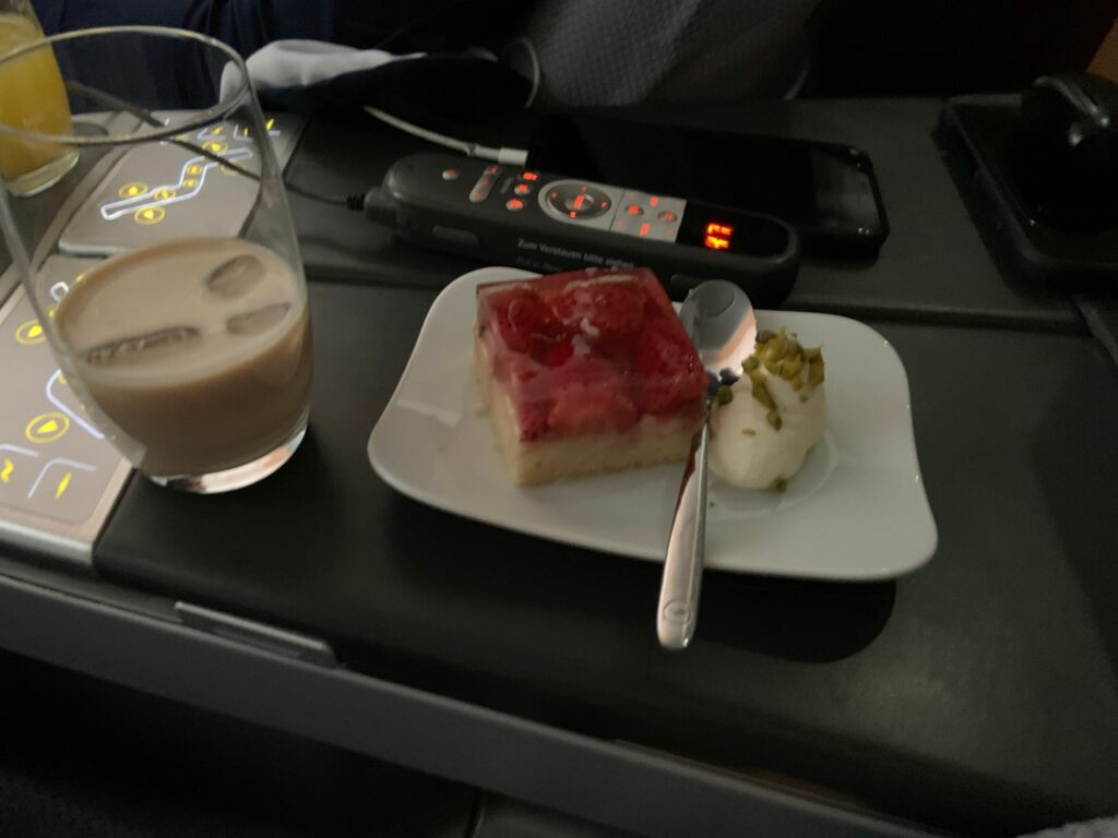Zum Käse äußerte ich den Wunsch einen Eiswein probieren zu wollen. Da es sich hier um ein exklusives Produkt der First Class handelt, war ich auf die Reaktion des Flugbegleiters gespannt. Zu meiner Überraschung schien dies auch kein Problem zu sein. Und so stand Käse und Eiswein keine drei Minuten später bei mir. Im späteren Verlauf des Fluges, zirka zwei Stunden nach dem ersten Service, bestellte ich außerdem noch einen Kuchen samt Baileys. Auch dies erhielt ich nach kürzester Zeit.