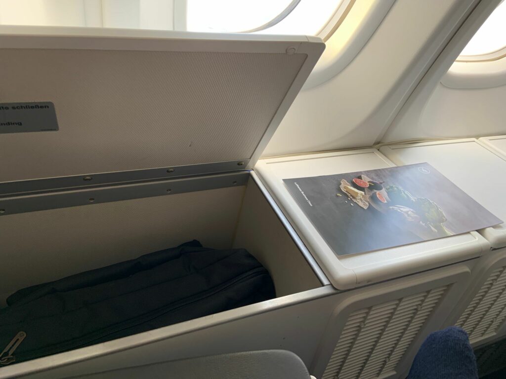 Die Fensterplätze im Oberdeck bieten darüber hinaus noch einen extra Komfort. Denn an der Bordwand sind extrem große Fächer untergebracht, welche sogar einen kleinen Koffer aufnehmen können. Darüber hinaus hat man bei geschlossenem Fach eine enorme Ablagefläche neben sich. Natürlich lagen Kissen und Decken auf den Sitzen  bereit und auf Nachfrage erhielten andere Passagiere auch noch ein Extrakissen. Ich selber nutzte meinen Sitz lediglich in der „Relax-Funktion“ und empfand diese als ideal um mal kurz die Augen zu schließen oder zu lesen. Das Entertainment nutzte ich allerdings auf diesem Flug nicht, aber fast alle anderen Passagiere um mich herum taten dies.