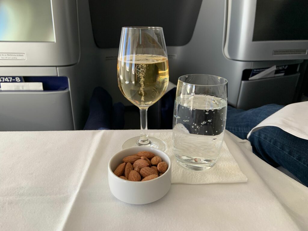 Der von mir bestellte Champagner stand auch kurze Zeit später perfekt temperiert samt Nüssen auf dem Tisch.